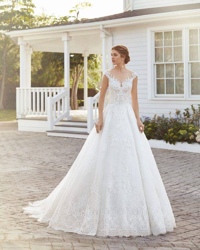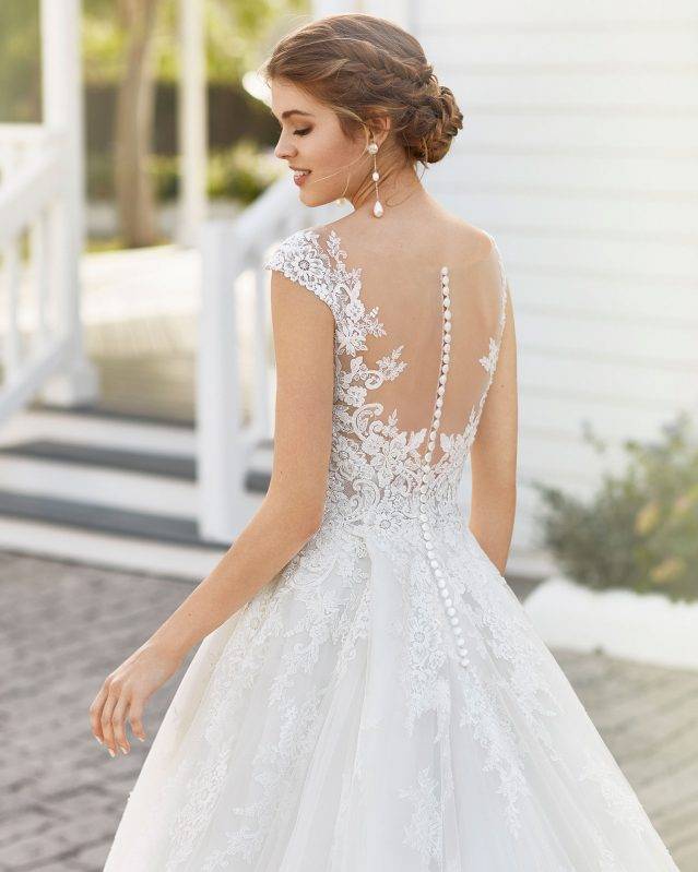 Robe de mariée Rosa Clara CLARISA, made in Barcelona, Haute couture mariage, est une magnifique robe de mariée romantique toute en dentelle; décolleté en V sur le devant, le dos est boutonné et transparent en dentelle re-brodée : la jupe, volumineuse se termine par une très longue traîne en éventail. Dans cette robe de mariée haute couture, vous saurez affirmer votre style romantique et princesse.