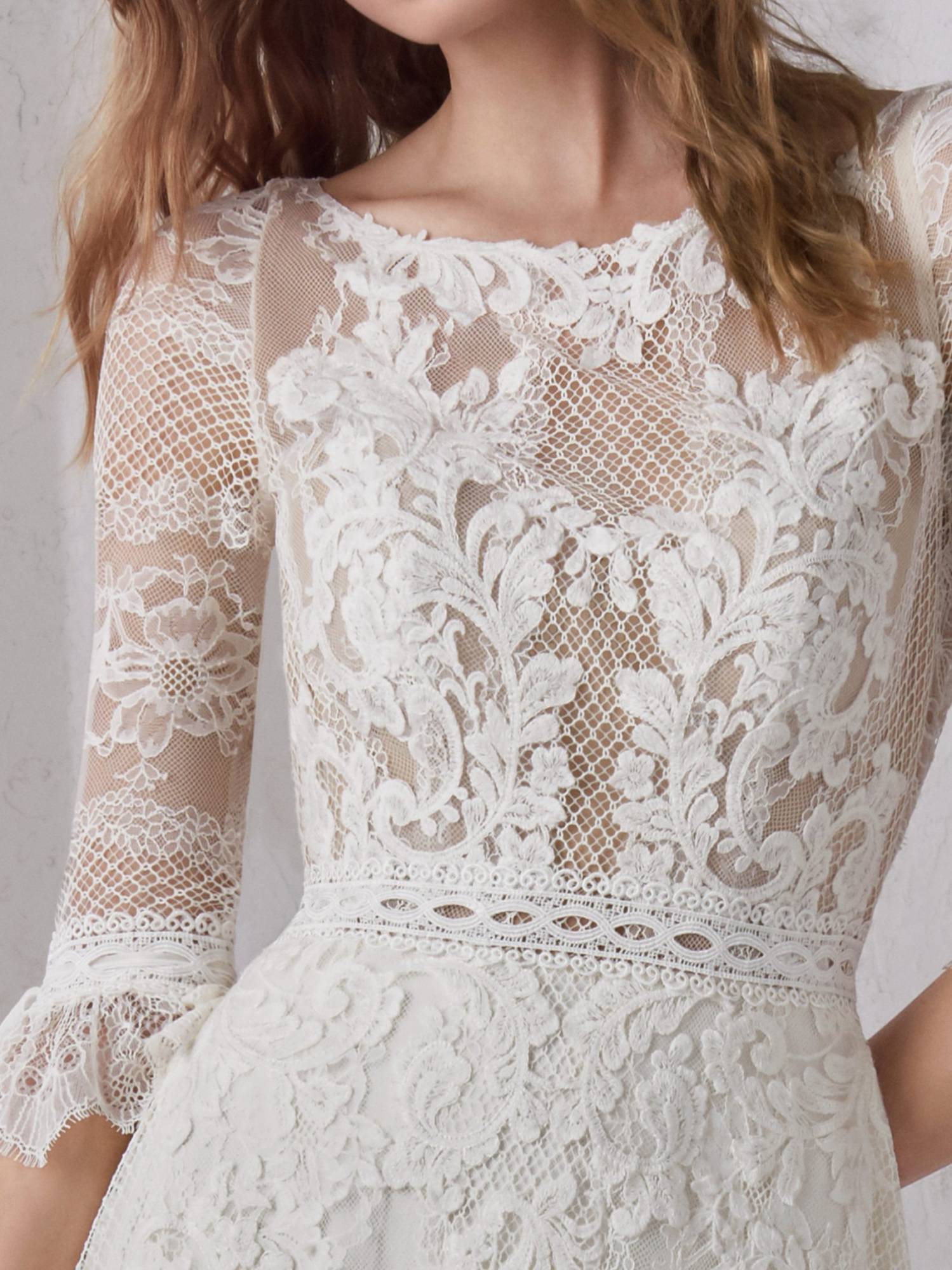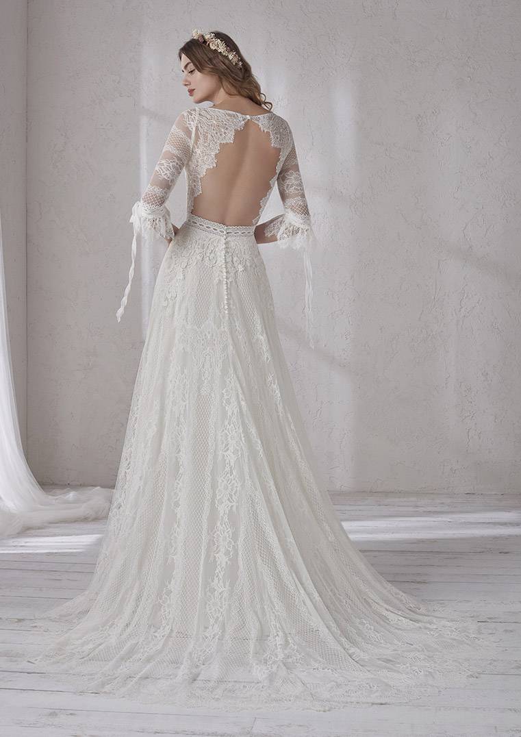 Cette somptueuse robe de mariée garden party, référence Mélanie du groupe Pronovias est de forme droite fluide, le haut est composé de manches transparentes à effets dentelle motifs de fleurs. Le bas de cette robe de mariée est en dentelle, cette robe du créateur Pronovias s’inscrit dans une ambiance de style rétro Shabby chic romantique.