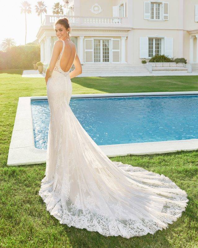 Cette robe de mariée sirène Rosa Clara Charlize est surprenante et totalement sexy pour le dos nu bijoux ajusté fourreau travaillée en transparence coloris blanc naturel tendance pour cette nouvelle collection mariage Rosa Clara 2020.
