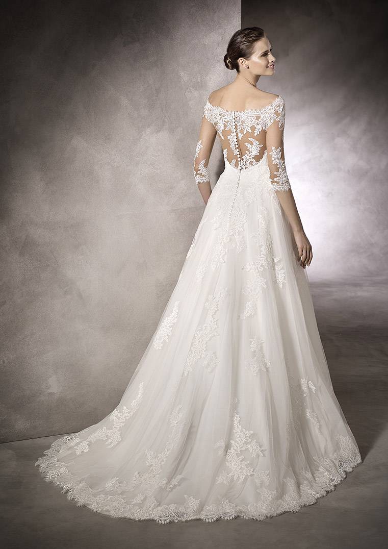 Cette robe de mariée en dentelle Pronovias référence Kimba est de forme princesse, le haut est composé d'un buste dentelle encolure bateau avec manches 3/4.
