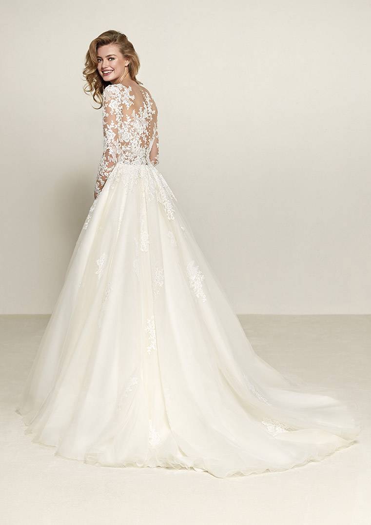 Cette robe de mariée Pronovias référence Drizana est de forme princesse, le haut est composé de dentelle effet tatouage sur tulle cristal nude.