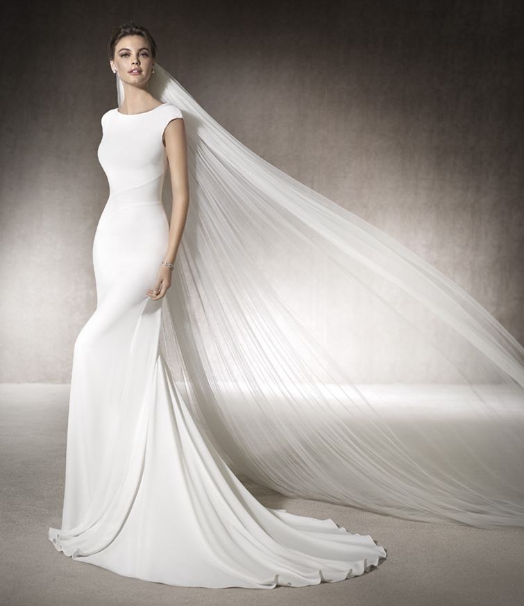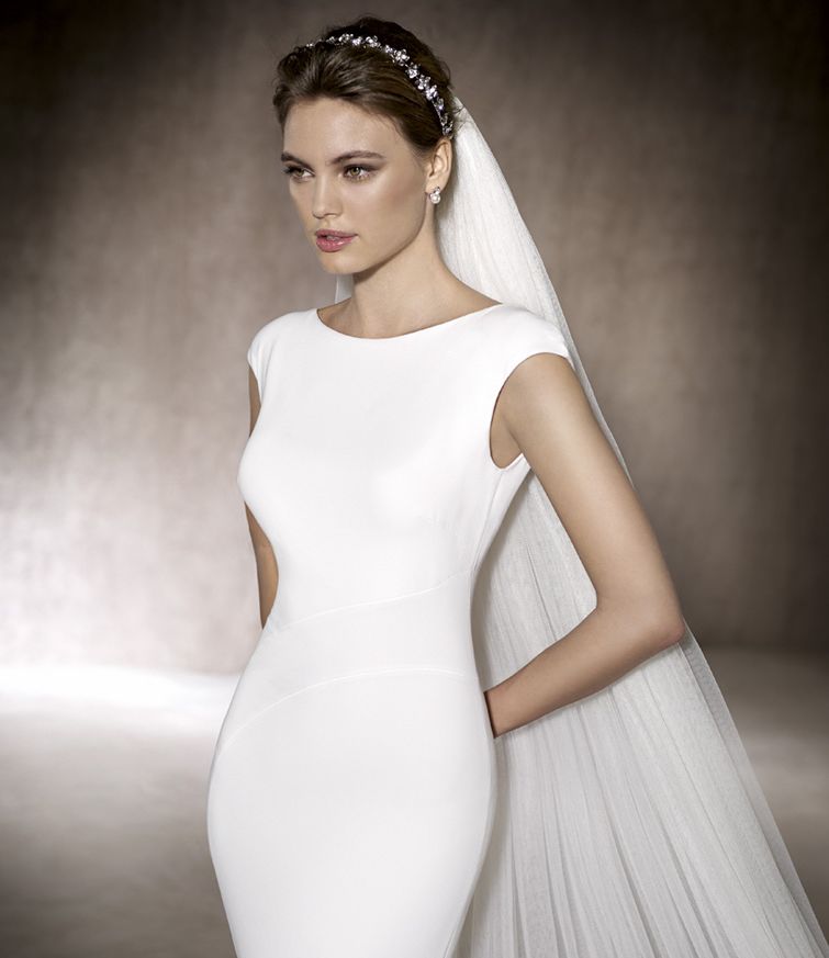 Robe de mariée en crêpe, un joli décolleté devant et dos cette robe de mariée coupe sirène ne pardonne rien car elle est ajustée et près du corps fourreau . Réservée à une mariée à la silhouette parfaite, le tissu fluide et léger appuyé sur les hanches et souligne les courbes de la future mariée.