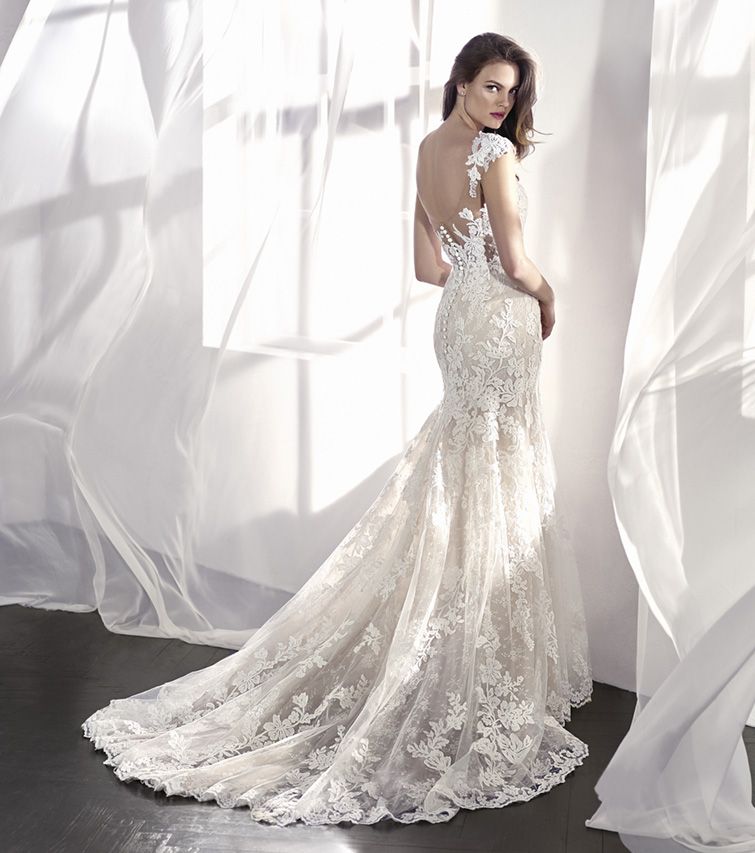 Sur le devant et dans le dos, le tulle cristal et les applications dentelle façon tatoo fusionnent sur la peau, créant un magnifique décolleté dos. Ce modèle de robe mariée de créateur s’accompagne également d’une doublure coloris chair pour atténuer les transparences du bustier. La robe mariage Leticia du groupe Pronovias est proposée dans un blanc naturel et un beige clair à effet couleur nude.