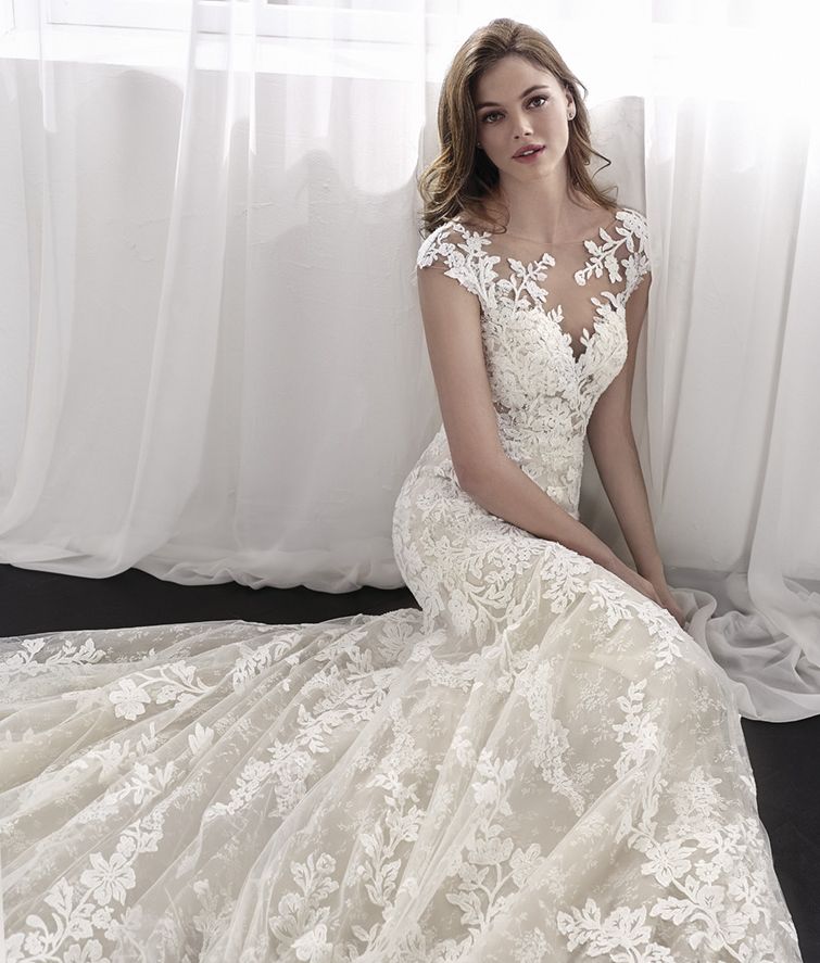 Cette magnifique robe de mariée San Patrick du créateur Pronovias collection 2018 coupe sirène près du corps, confectionnée en tulle brodé et en dentelle appliquée, ornée de fleurs en dentelle perlées. Ce modèle taille basse, attire tous les regards avec son bustier avec effets de transparences.
