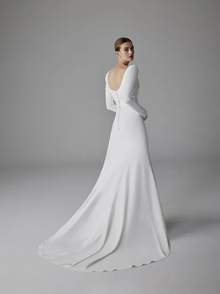 Le décolleté plongeant en forme de cœur de la robe de mariée OCCITANIA crée un look romantique tout en mettant en valeur le décolleté avec élégance. La jupe sirène en crêpe complète parfaitement la silhouette en offrant une coupe qui épouse les courbes tout en assurant une allure gracieuse. Les manches longues apportent une touche classique, tandis que les détails soignés comme les manches longues ajustées et les épaules légèrement bouffantes confèrent une allure chic.