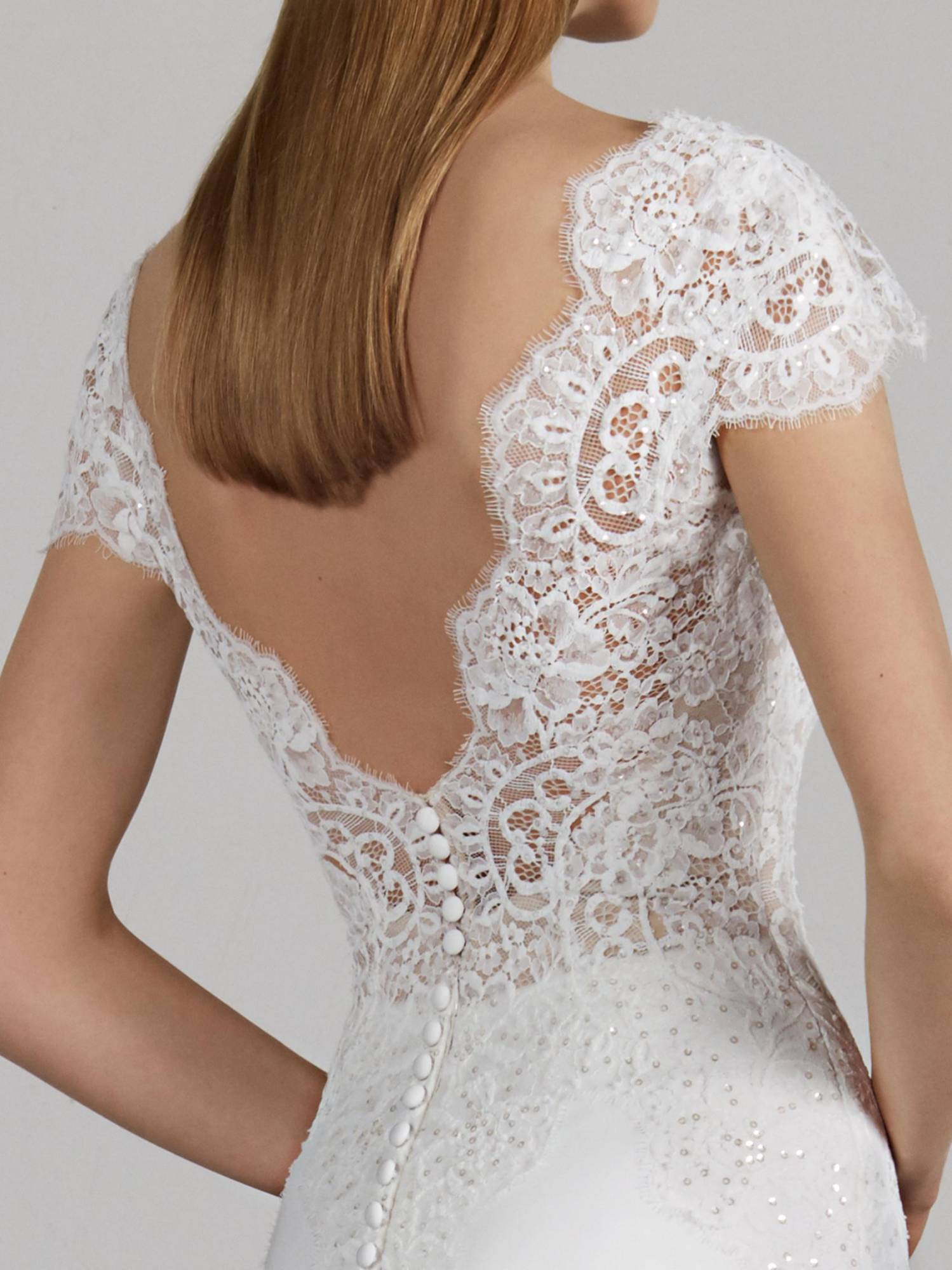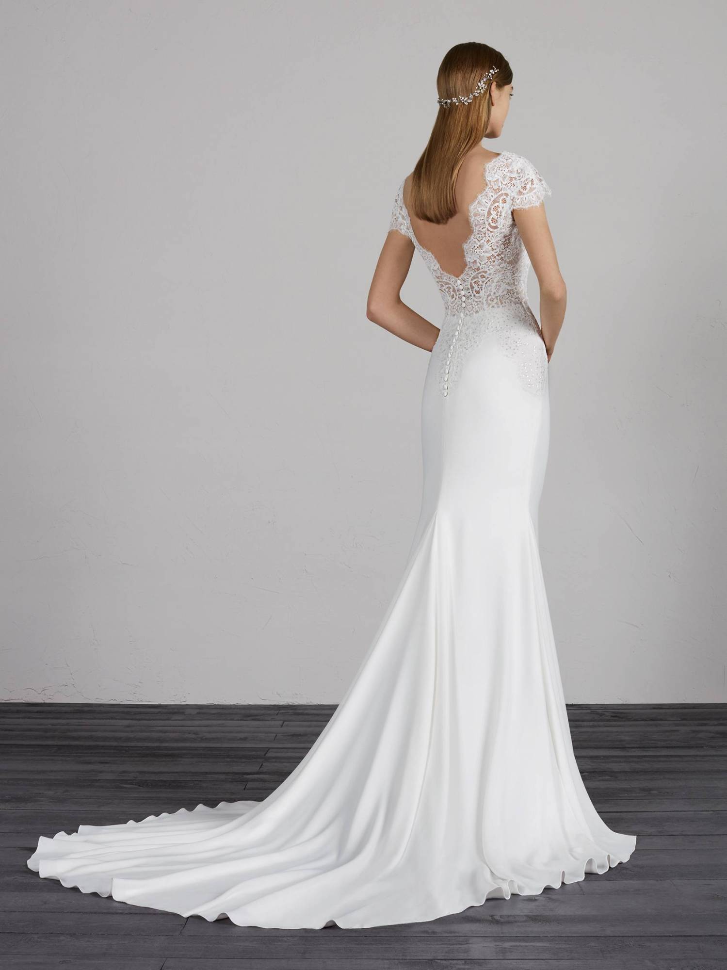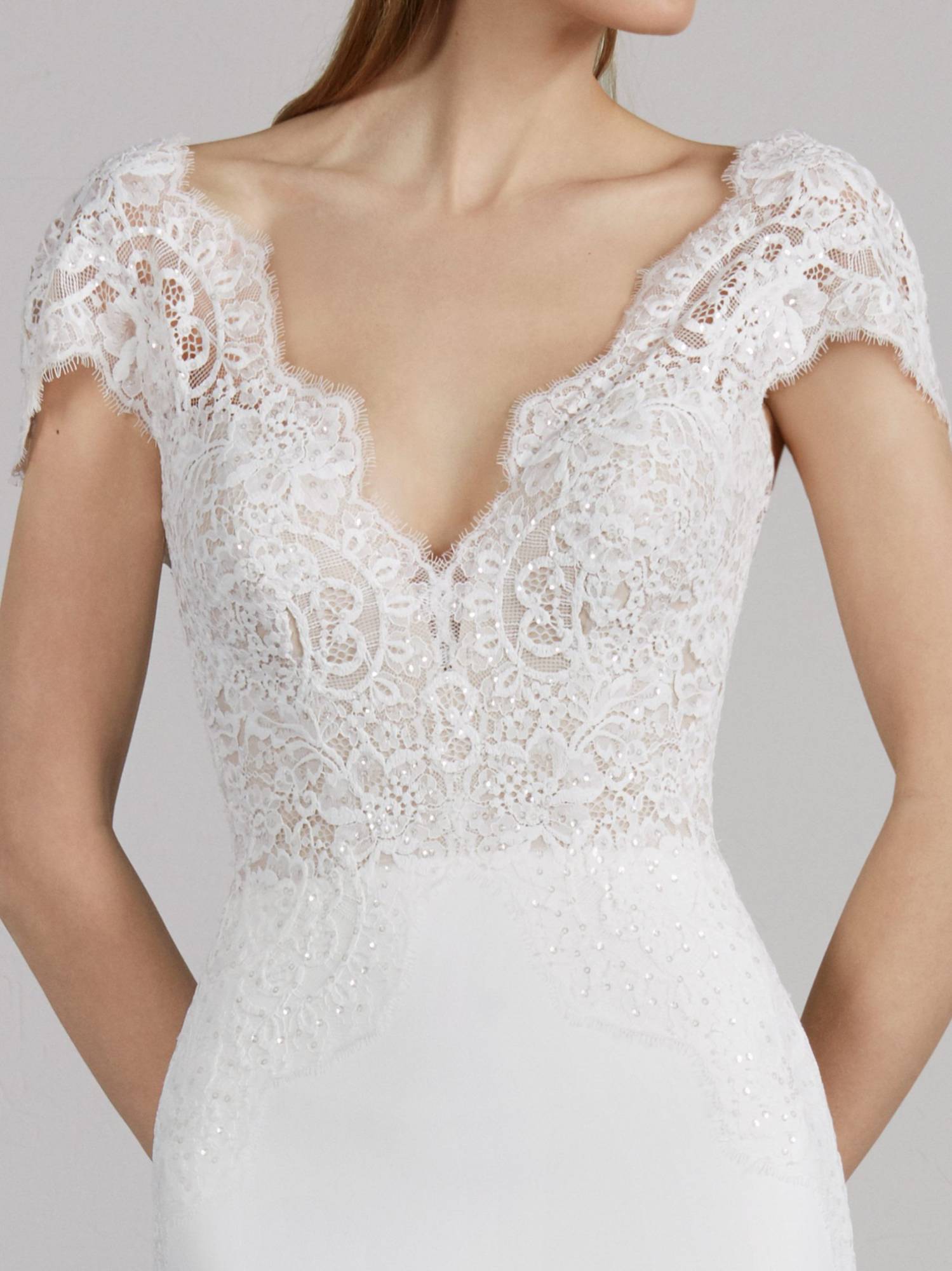 Cette robe de mariée Pronovias référence Milady est de forme sirène, le haut est composé de dentelle brodée de sequins, le bas de cette robe de mariée est en crêpe, ajustée près du corps , cette robe de mariée du créateur espagnol Pronovias s’inscrit dans une ambiance de style glamour et sexy chic.
