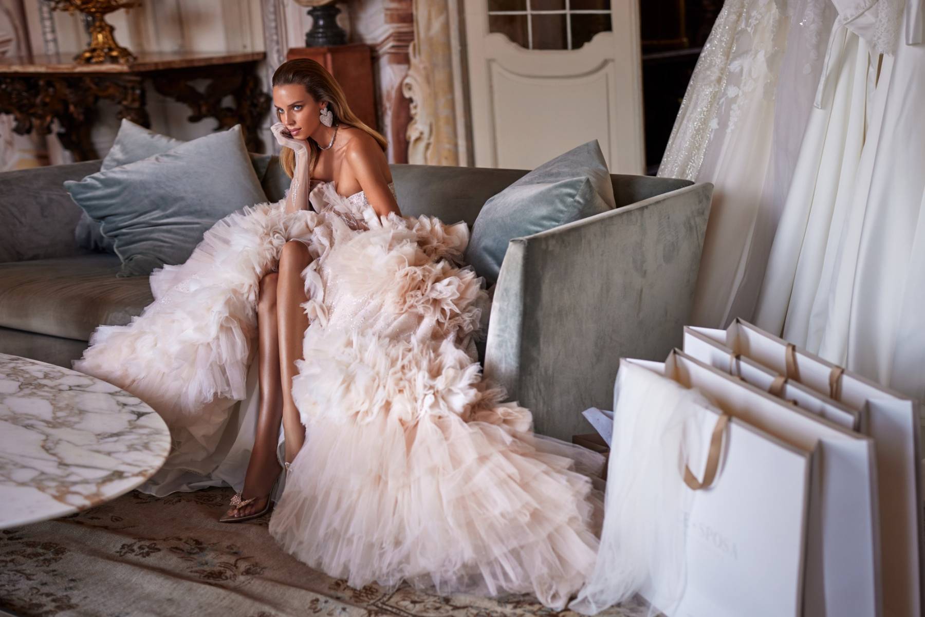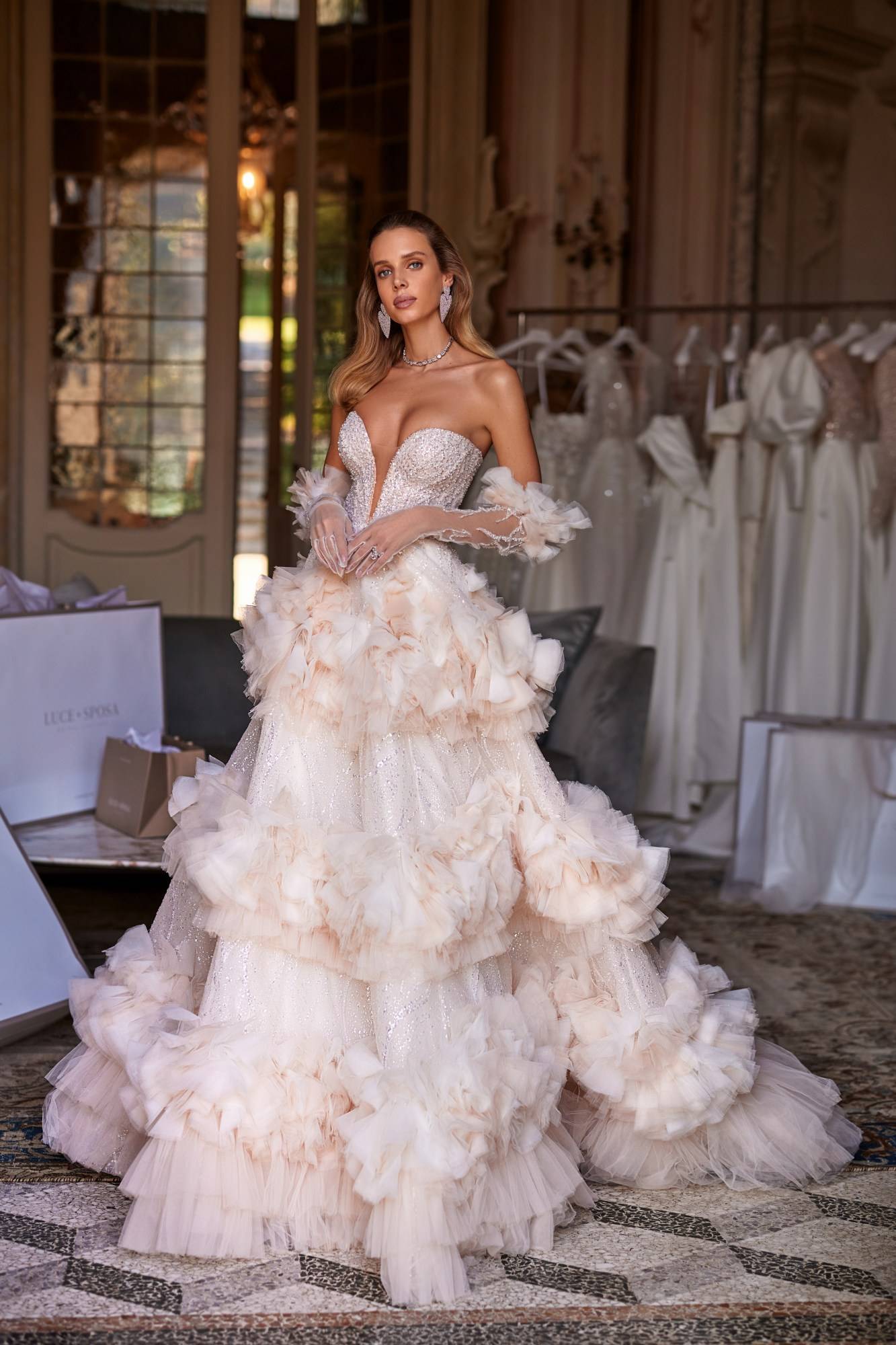La robe de mariée référence Blush de Luce Sposa, forme princesse bustier décolleté en cœur, confectionnée en tulle et paillettes avec une maille étincelante de dentelle fine coloris rose poudré se démarque par sa forme de jupe princesse spectaculaire à étages de volants de Tulle Froncé.