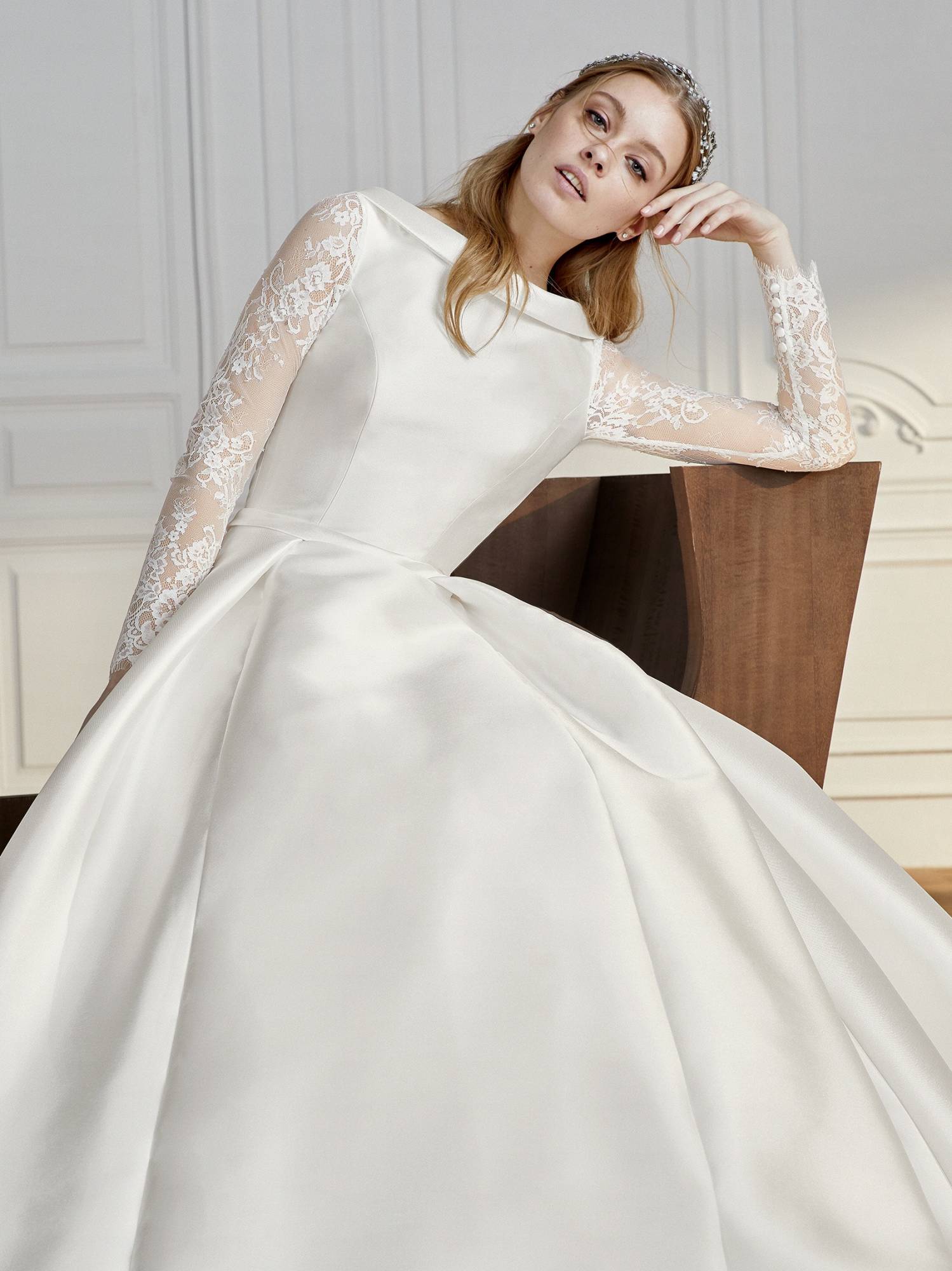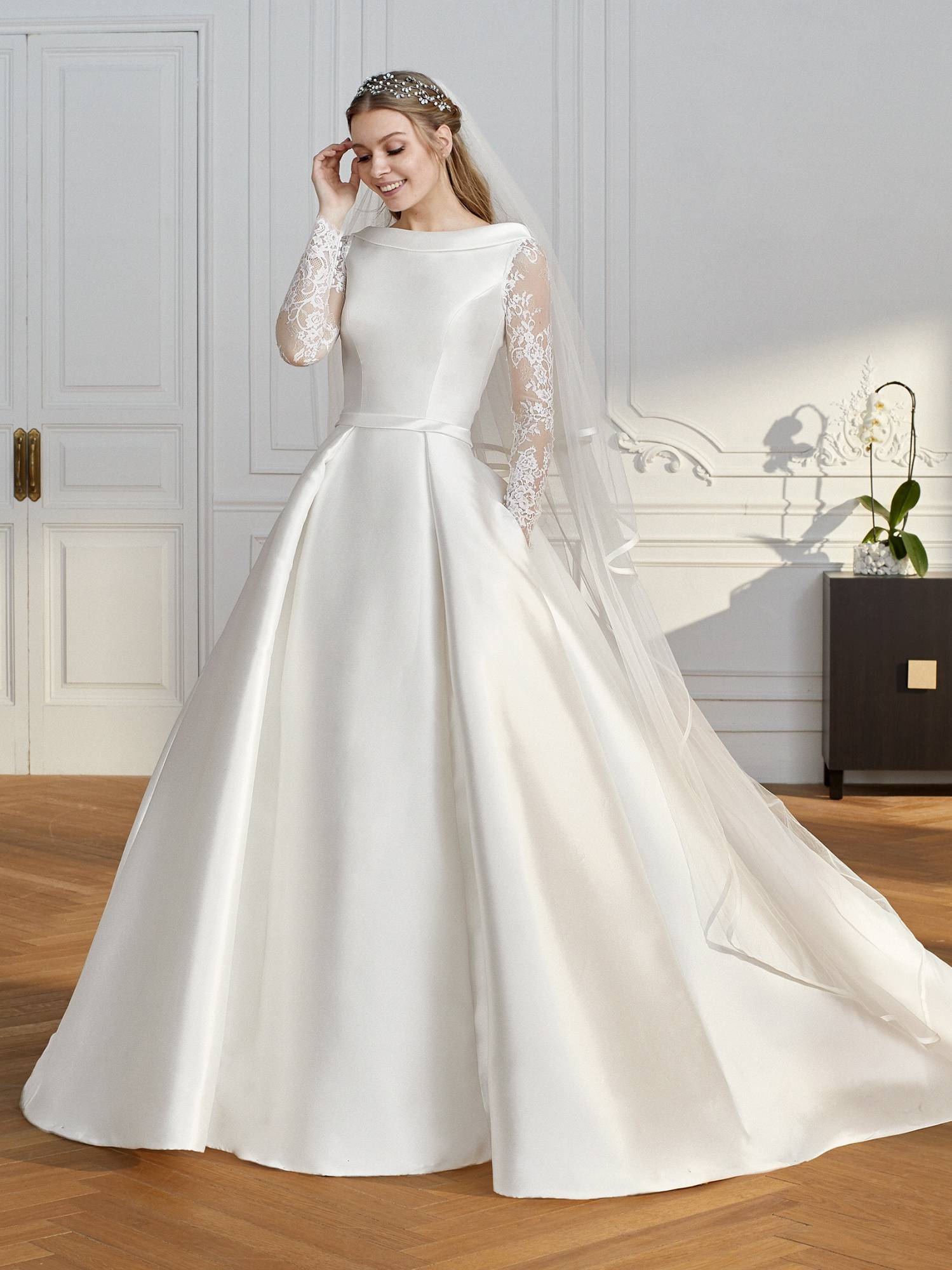 Robe de mariée en mikado kelly majestueuse de mariée princesse bi-matières en mikado et dentelle à manches longues en dentelle appliquée est disponible dans notre concept store enseigne Soniab créateurs Marseille 13007 net 13006 et 13001. Référence Musset marque et créateur San Patrick nouvelle collection 2020.