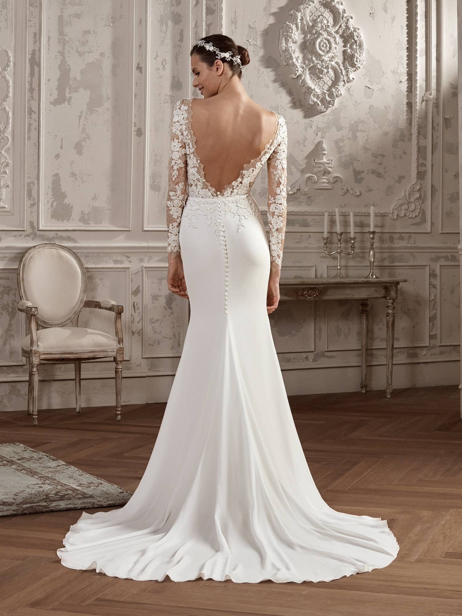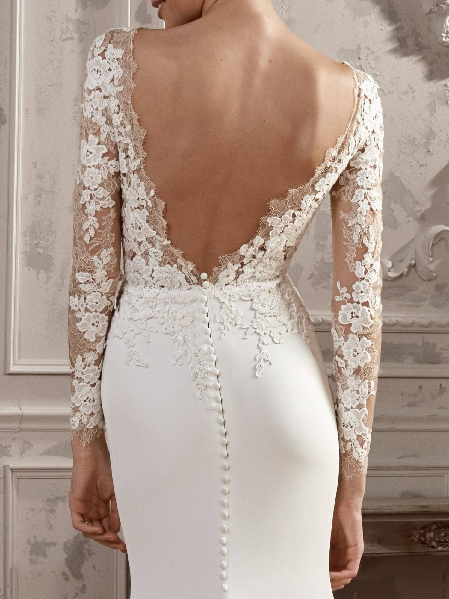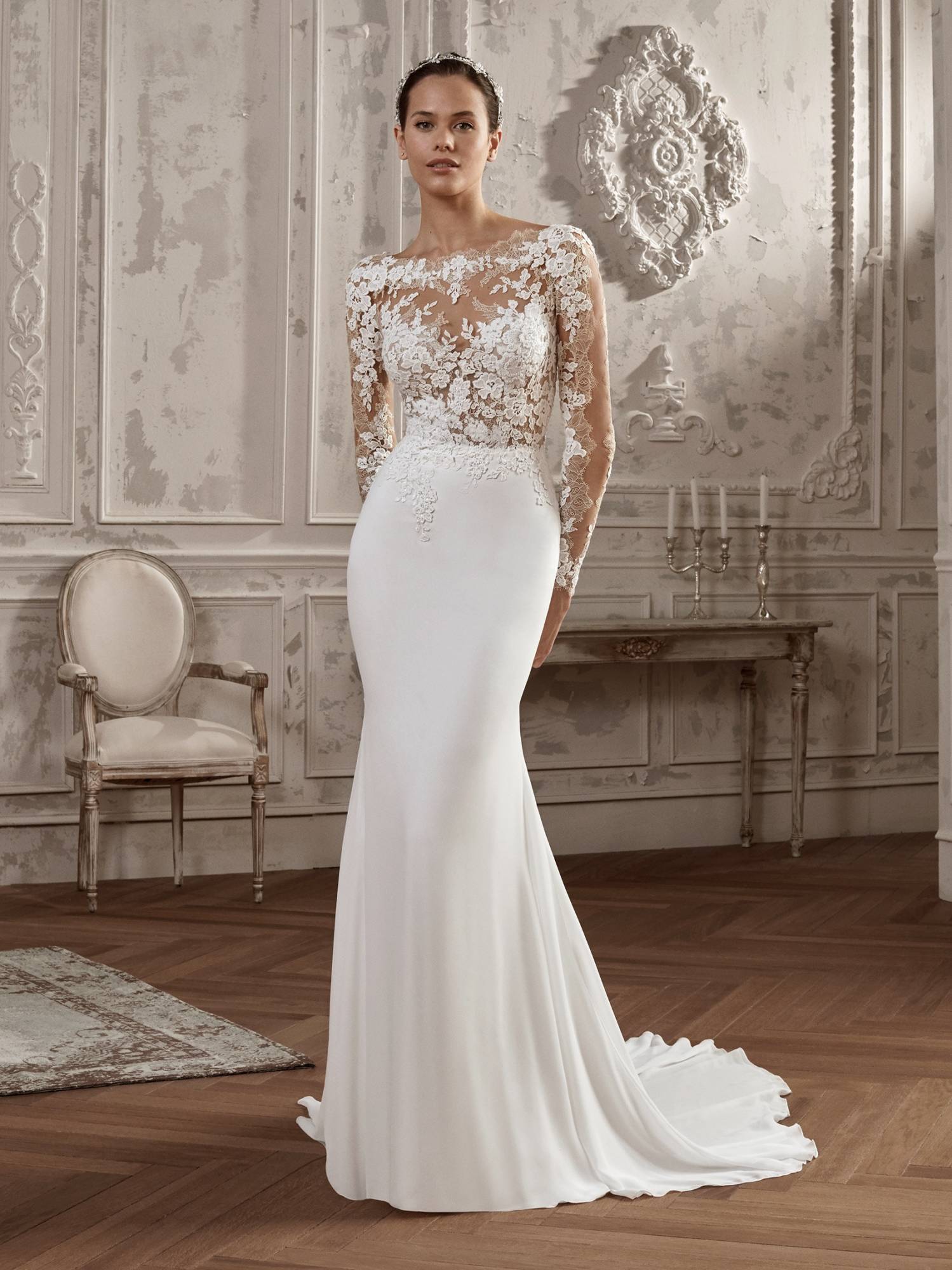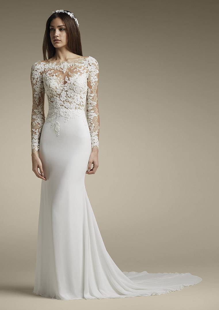 Cette robe de mariée Pronovias référence Alcira est de forme près du corps, le haut est composé d'applications dentelle sur un tulle de crystal, le bas de cette robe de mariée est en matière crêpe georgette, cette robe du créateur Pronovias s’inscrit dans une ambiance de style sexy chic.