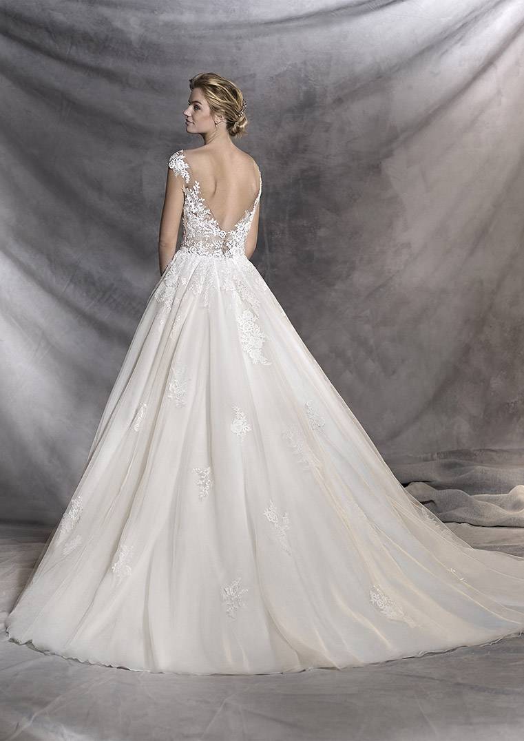Cette robe de mariée Pronovias référence Ofelia est de forme princesse, le haut est composé d'un tulle transparent brodé, le bas de cette robe de mariée est volumineux, cette robe du créateur Pronovias s’inscrit dans une ambiance de style princesse moderne et romantique .