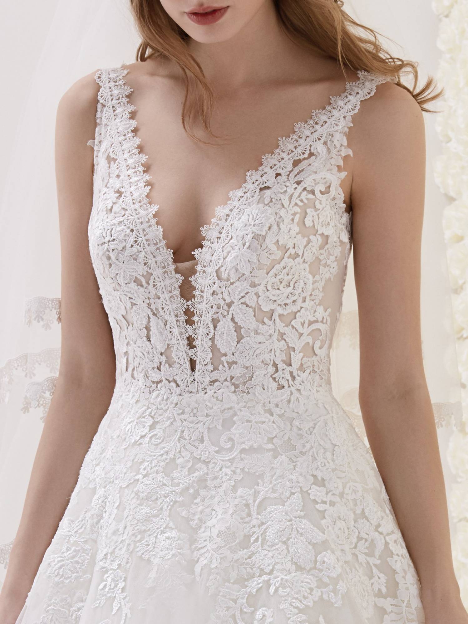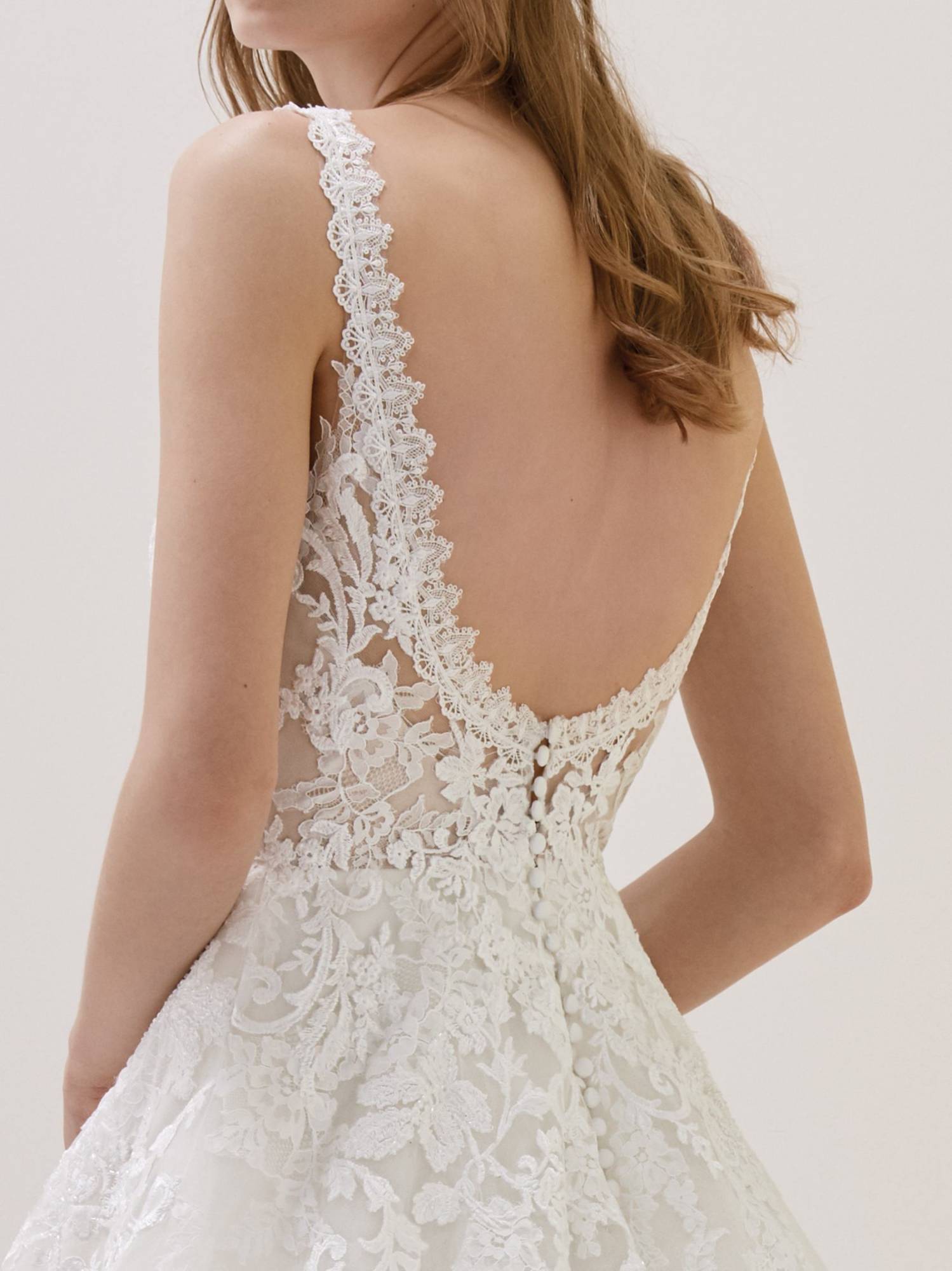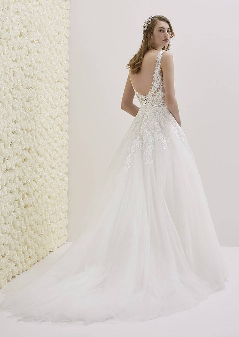 Choisissez cette magnifique robe de mariée Pronovias référence Estibaliz, de forme princesse, avec son bustier composé de bretelles en dentelle ajourée d'un décolleté plongeant effet glamour garanti, la jupe de cette robe de mariée est en tulle trapèze en A.