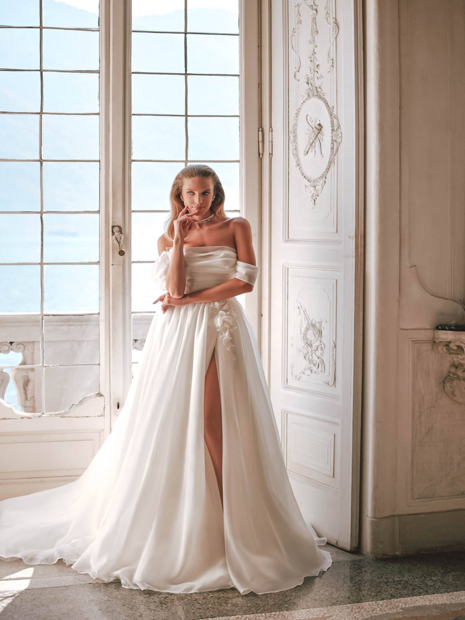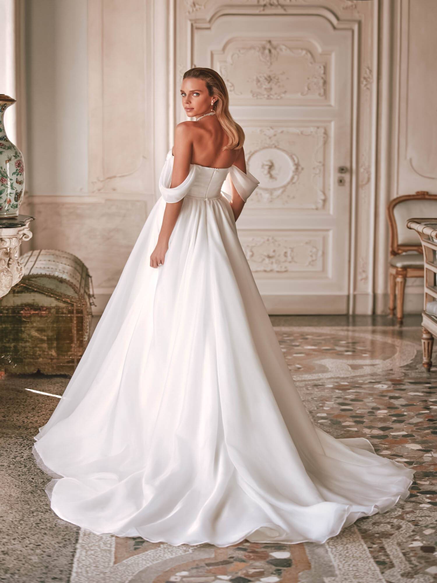 La robe de mariée princesse en organza modèle"Teresa" de Luce Sposa, disponible à Soniab Marseille au 33 rue Rigord 13007 Marseille, cette robe de mariée princesse en Organza est un incontournable de la robe de mariée contemporaine par sa sobriété et sa légèreté. Cette robe de mariée, avec sa forme trapèze princesse, enveloppe délicatement la silhouette par son bustier drapé. Les épaules dénudées et ses bretelles retombantes ornées de fleurs en relief ajoutent une touche de modernisme, tandis que la traîne longue en organza crée une impression de rêve et de légèreté.