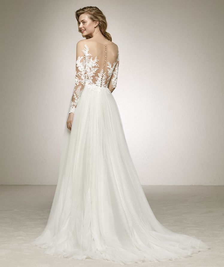 Dans un esprit champêtre chic, la robe de mariée Datil une sublime création originale de Pronovias, vintage avec une jupe en tulle doux "Morbido" touché soie, qui dessine la taille au niveau des hanches.
