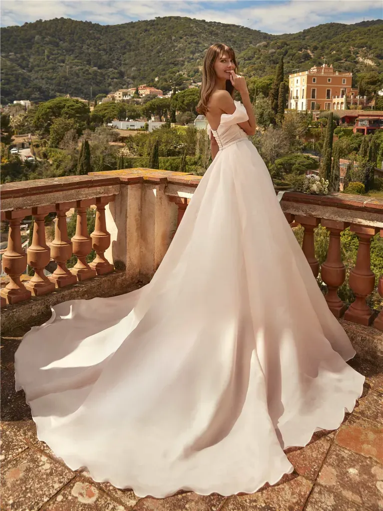 La robe de mariée Clipa de Nicole Milano incarne une silhouette princesse vaporeuse en organza. Son décolleté en cœur et son dos en V équilibrent le volume de la jupe avec une touche de sensualité moderne. L'organza léger crée un effet aérien et romantique, idéal pour une mariée qui veut se sentir comme dans un conte de fées.
