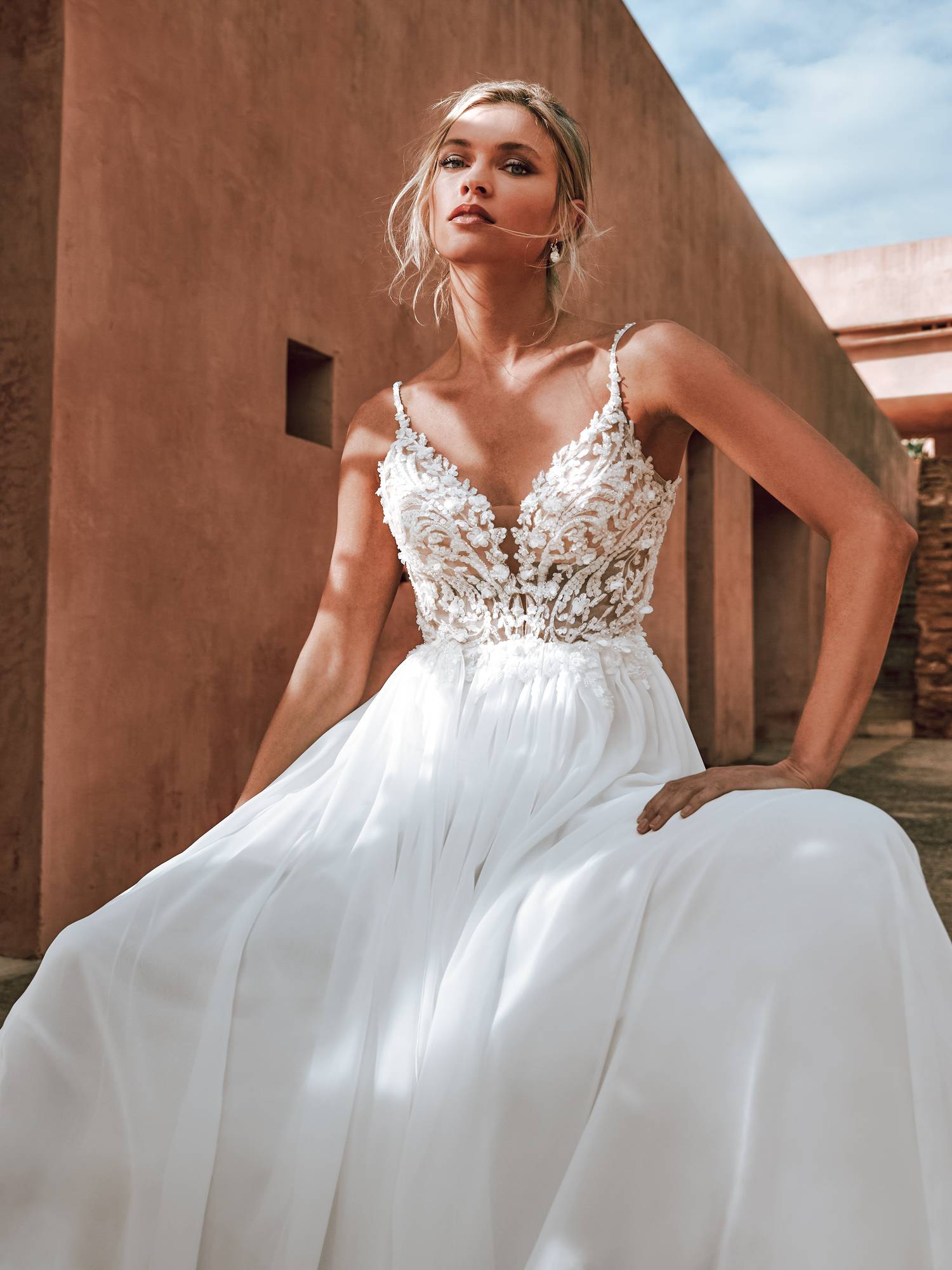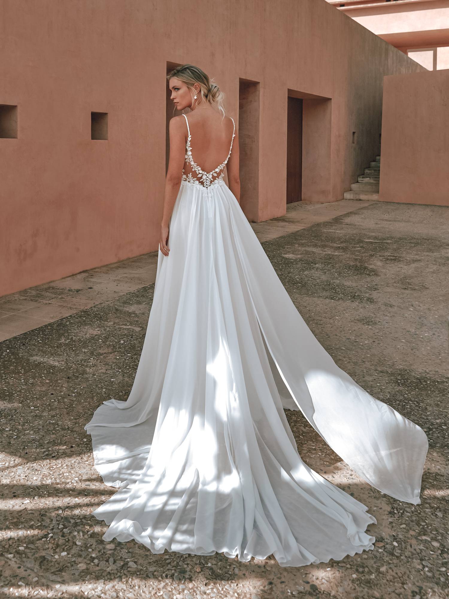 En ajoutant simplement deux traînes longues en mousseline, la robe de mariée Corinzia se transforme en une pièce spectaculaire, adaptée à un mariage de luxe en Provence. Notre magasin près d'Aubagne offre une variété d'accessoires pour compléter et personnaliser votre robe de mariée trapèze dans le Sud de la France, permettant à chaque mariée de refléter son style personnel tout en respectant le cadre et le thème de son mariage.