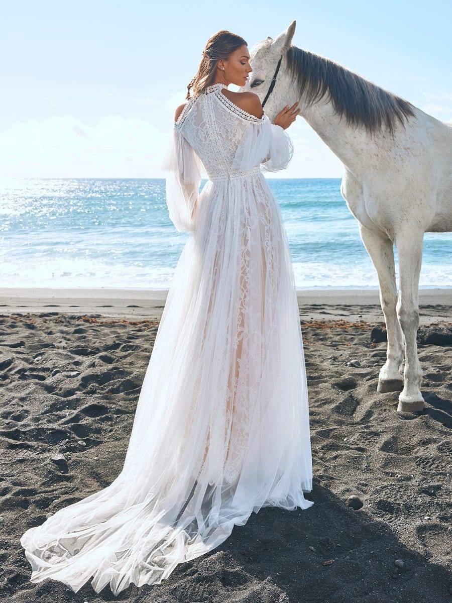 Le modèle Moher du créateur Pronovias est une robe de mariée évasée, confectionnée en tulle fin brodé de dentelle, avec des manches bouffantes et amovibles. Cette robe incarne un style bohème sensuel, avec une jupe fluide flottante jouant sur la transparence, la dentelle guipure et chantilly. C’est le choix idéal pour un mariage romantique en Provence.