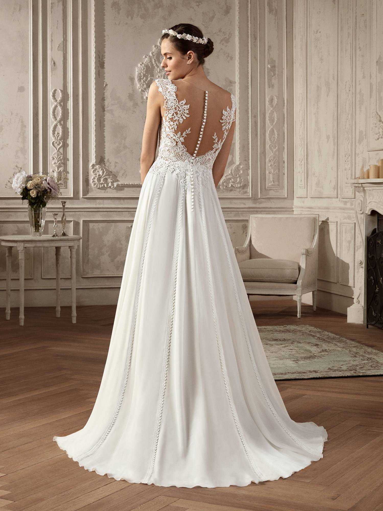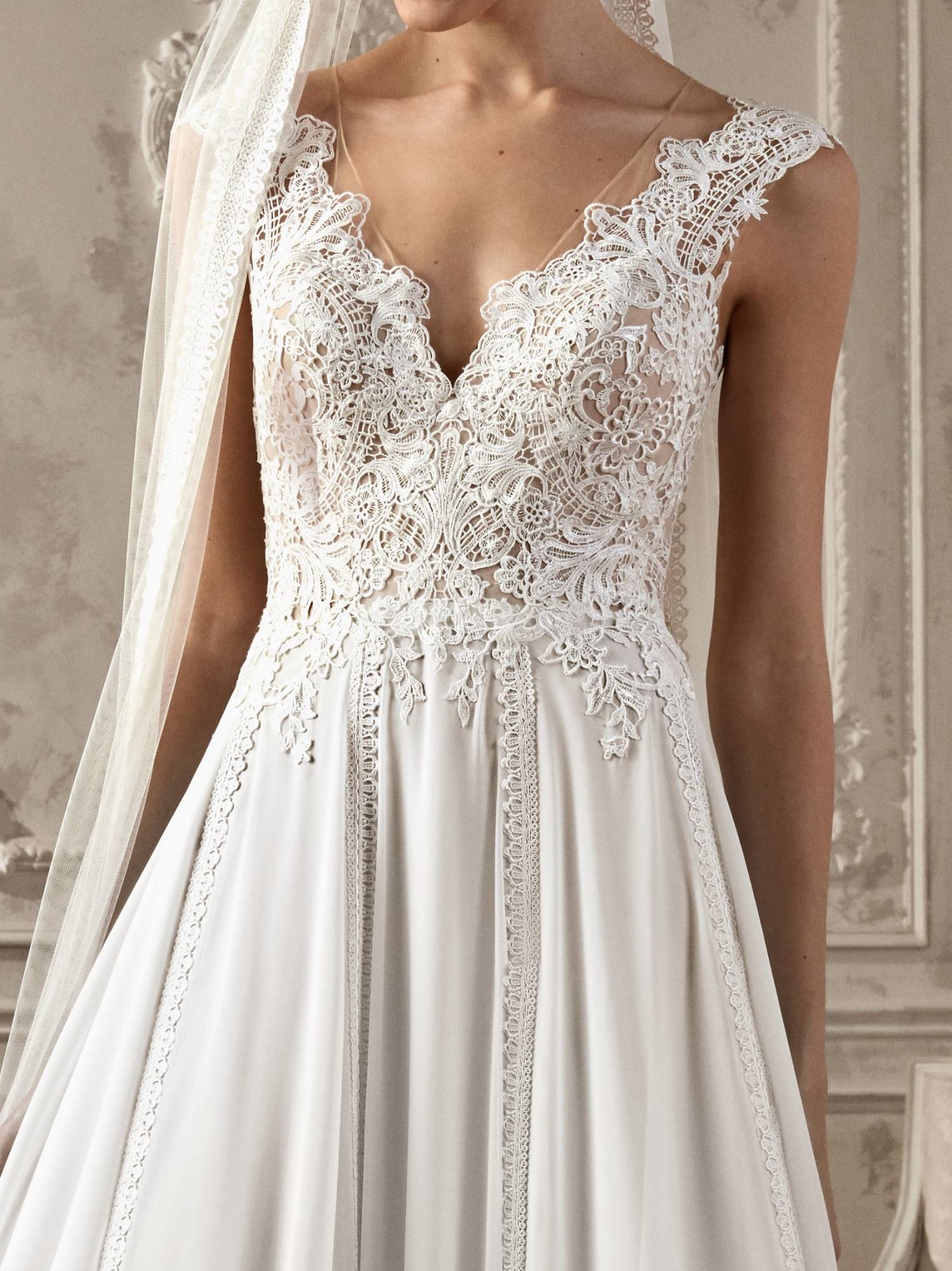 Votre robe de mariée Ambar de San Patrick forme princesse romantique est disponible dans notre boutique Soniab show-room de créateurs et stylistes sur Marseille centre-ville, cette robe en dentelle est destinée à une clientèle plus classique et traditionnelle de robe à volume suivie d’une longue traîne.