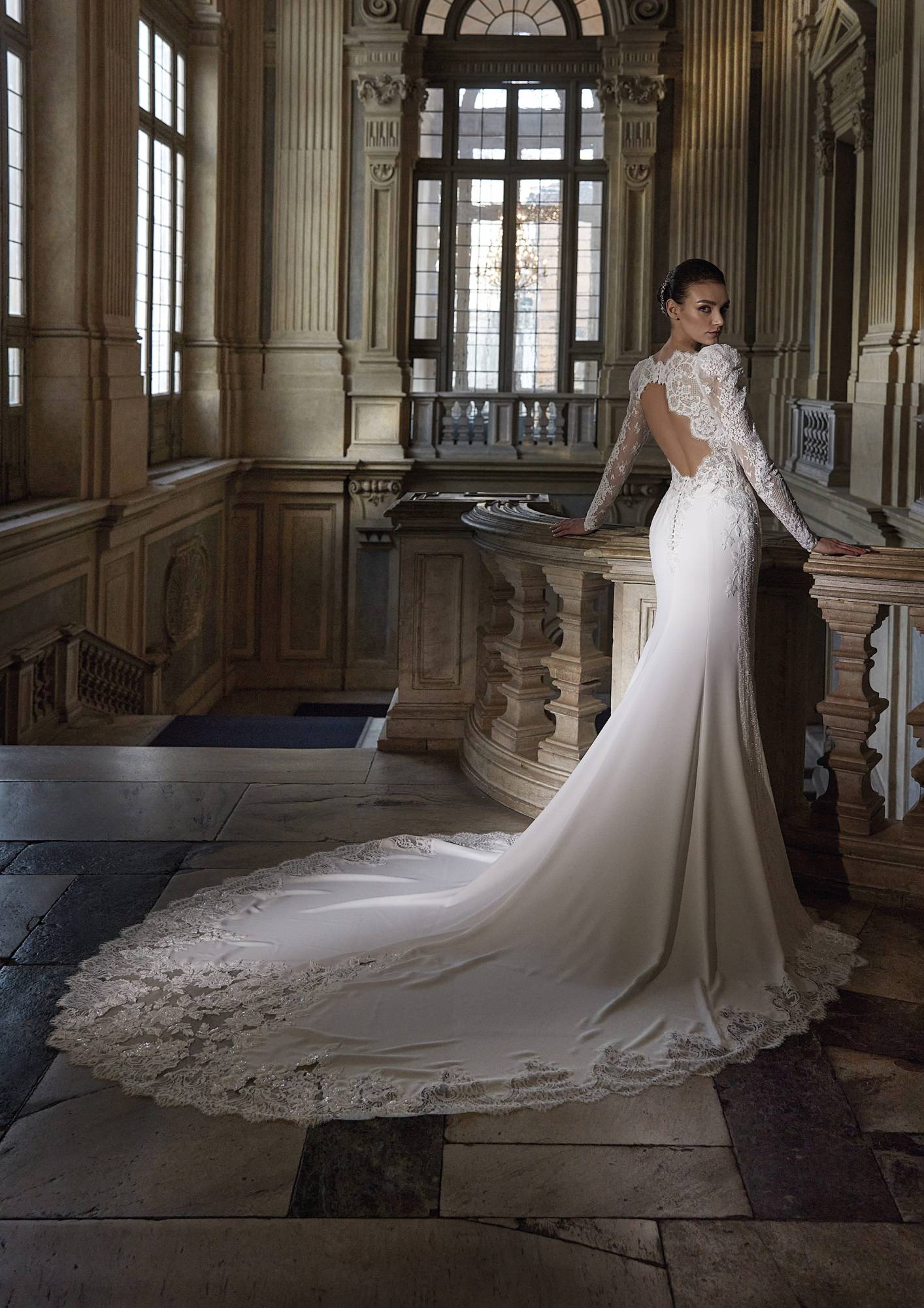 Découvrez "Absidian", une robe de mariée en crêpe fluide au style éblouissant signé par Pronovias Privée. Cette création raffinée de style sirène est façonnée dans un crêpe doux et délicat qui épouse harmonieusement chaque courbe de votre silhouette suivie d'une traine spectaculaire. Le corsage en dentelle délicate, agrémenté de manches longues en dentelle, confère un charme romantique intemporel.