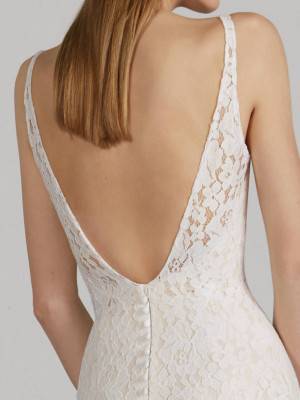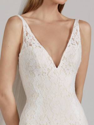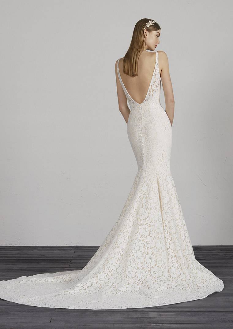 Cette robe de mariage Pronovias référence Mosaico est de forme près du corps, le haut est composé de fines bretelles brodées, le bas de cette robe de mariée est évasée, cette robe du créateur Pronovias 2019 s’inscrit dans une ambiance de style tendance et glamour.
