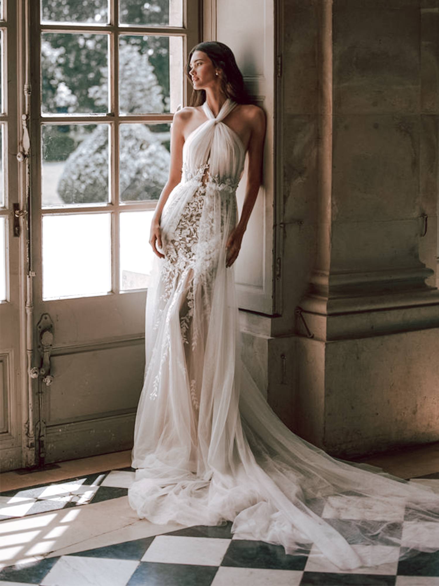L'usage du tulle drapé pour le corsage apporte une touche de légèreté et de romantisme, idéale pour une cérémonie à la fois traditionnelle et contemporaine. La forme semi-transparente et la coupe ajustée sont pensées pour célébrer et accentuer les courbes, offrant une silhouette à la fois gracieuse et séduisante. En outre, la bretelle autour du cou est un détail qui ajoute un cachet moderne et peut parfaitement compléter un thème de mariage sophistiqué.