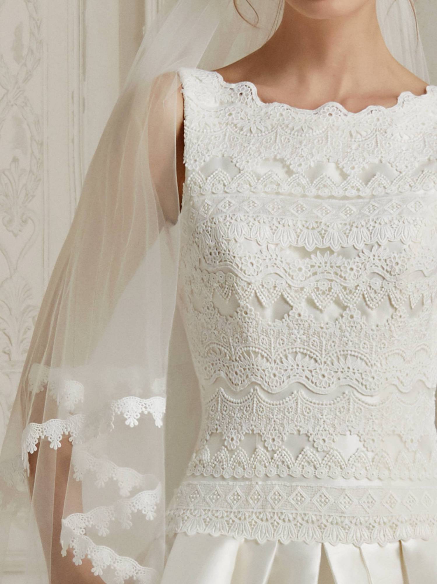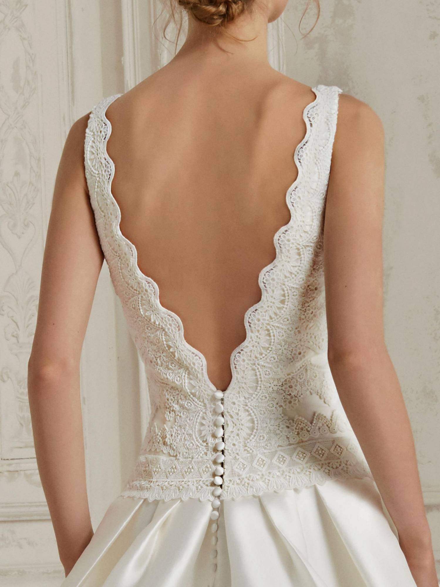 Cette robe de mariée Pronovias référence Malaga est de forme princesse jupe plis creux et poches , le buste encolure bateau en dentelle guipure géométrique , le bas de cette robe de mariée est en mikado avec une longue traine, cette robe du créateur Pronovias s’inscrit dans une ambiance de style sobre et chic, à la fois vintage et épurée.