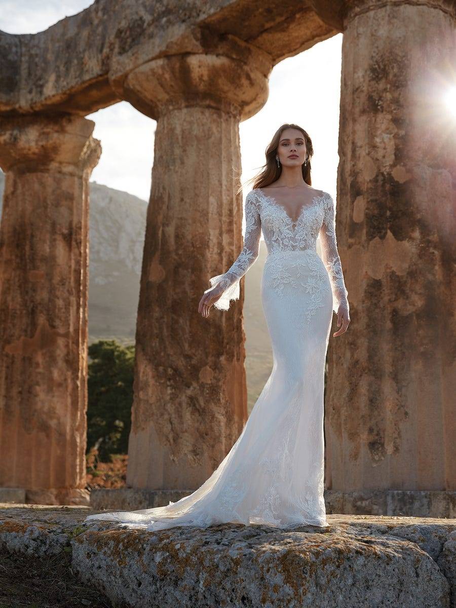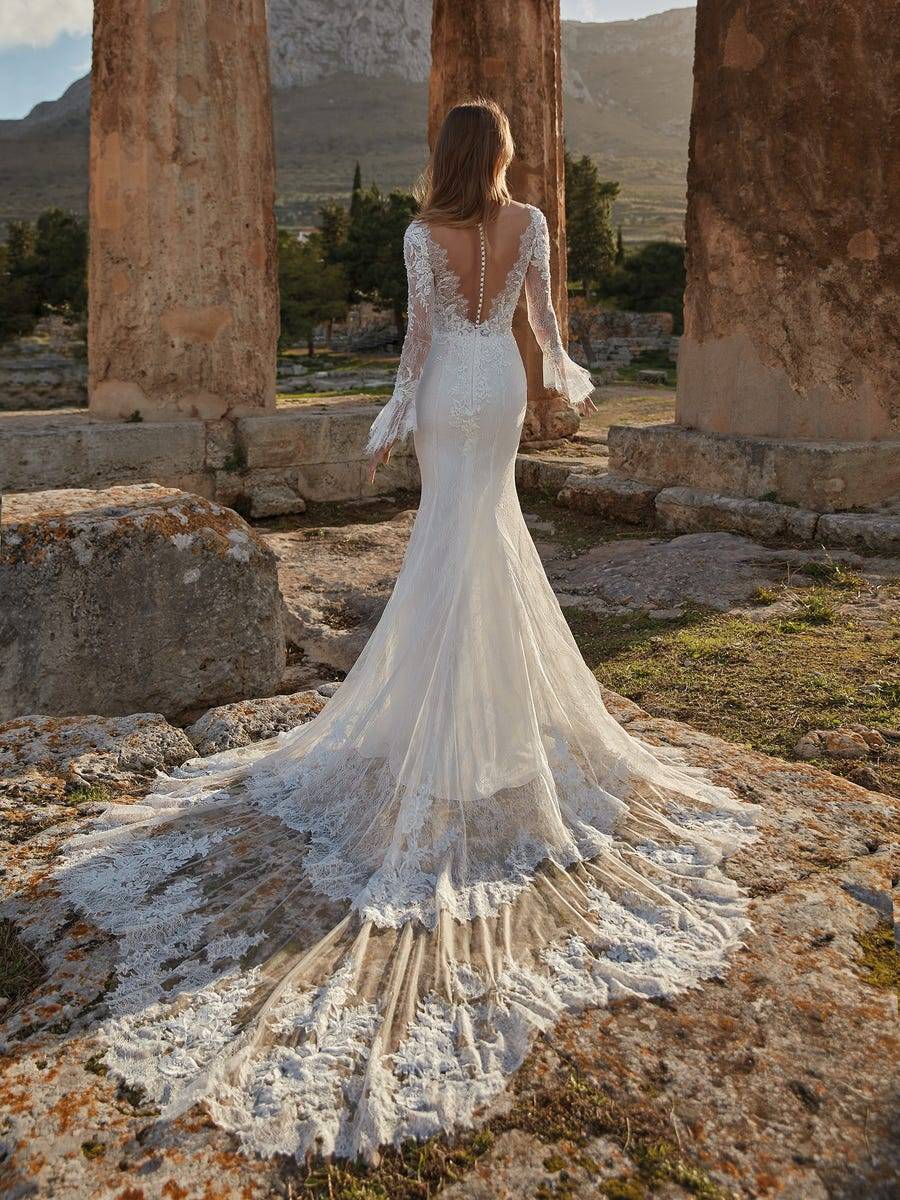 Le show room de robe de mariée vous propose la robe référence Écate Nicole Milano Spose ajustée près du corps en dentelle fines chantilly Soniab Créateurs situé en plein centre ville de Marseille vous propose ce modèle sirène dans un style bohème décontracté chic pour se marier en Provence ou en mariage extérieur garden partie.