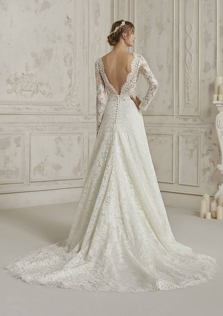 Où trouver sa robe de mariée bohème chic référence Margot, à Marseille ? Cette robe mariage classique Pronovias est de forme trapèze en A, le haut est composé de manches en dentelle, le bas de cette robe de cérémonie est terminé par un en galon de dentelle, cette robe du créateur Espagnol s’inscrit dans une ambiance de style bohème comme classique .