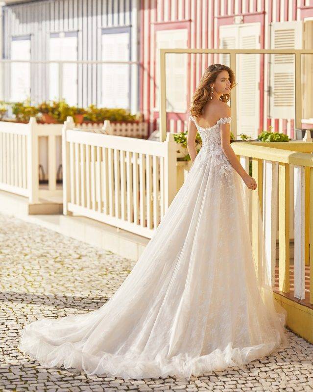 Robe de mariée Rosa Clara coloris rose poudré dans un style bohème vintage raffinée la robe de mariage Hayen est une robe trapèze recouvert de dentelle florale à gros motifs. Ce modèle de créateur affine la taille grâce à son bustier ajusté ainsi que ses bretelles retombantes au niveau des épaules et le tout associé à une jolie jupe en tulle fluide ornée d'applications de dentelle, légèrement transparente elle s'inscrit dans un style glamour chic.