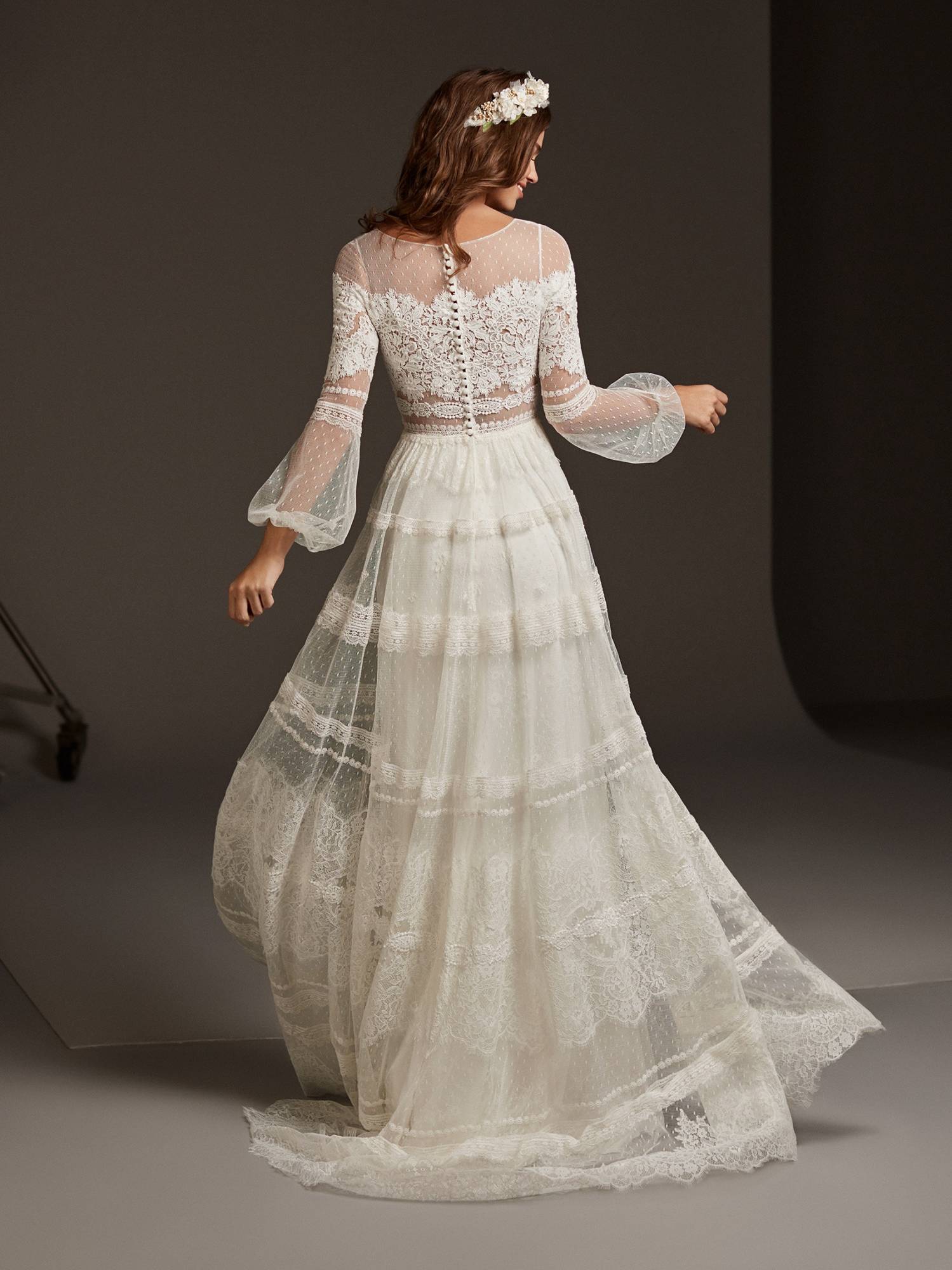 Une robe de mariée du groupe Pronovias modèle de créateur référence Delphine manches longues en dentelle et galons style bohème chic de la collection mariage 2020 essayer absolument, shabby chic, cette robe de créateur rétro et vintage au coloris blanc naturel positionnée sur le créneau robes de créateur différentes et originales tendance champêtre et bohème ! Il est préférable de prendre un rdv, pour essayer cette création dans notre show room spécialisé sur Marseille 13007.