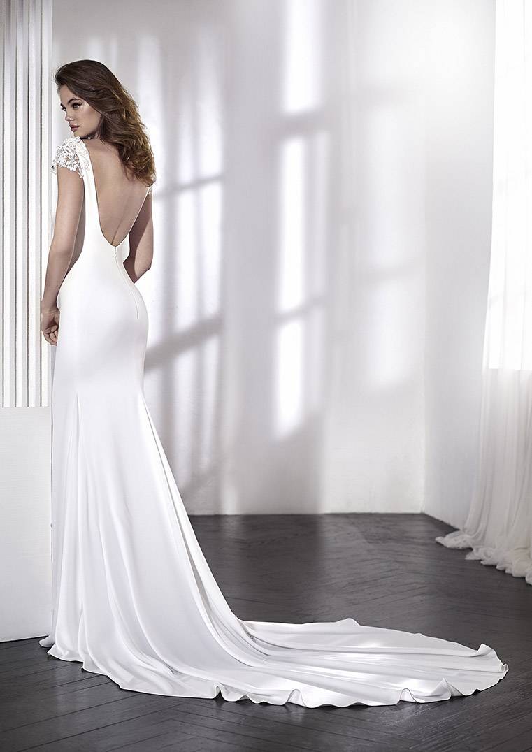 robe de mariée Pronovias référence Lara est de forme fourreau droite en crêpe simple, le haut est composé de perles , le bas de cette