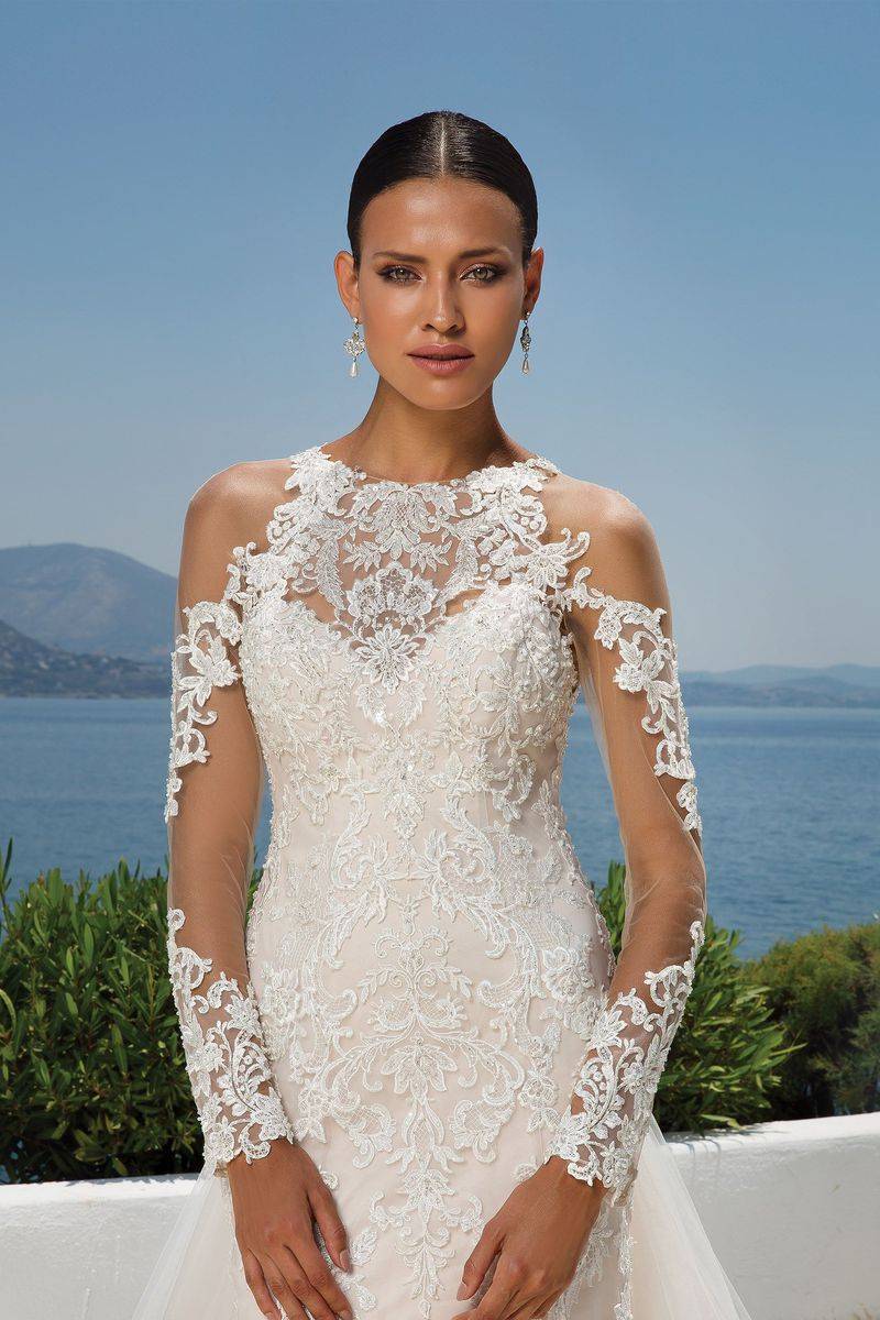 Robe sirène Justin Alexander référence 8964 manches longues en dentelle d'une grande élégance pour cette robe de mariée entièrement composée de dentelle Chantilly, avec des découpes festonnées à l’effet asymétrique féminin et une magnifique jupe ajustée confectionnée dans le même motif floral délicat.