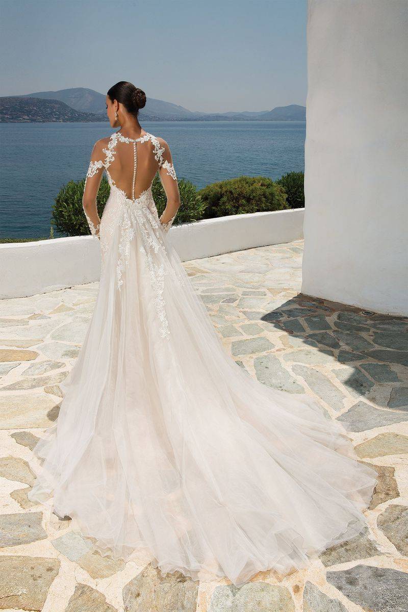 Cette robe de mariée glamour chic est surprenante et totalement sexy pour le dos ajusté fourreau travaillée en perles et en transparence coloris blanc naturel très tendance pour cette nouvelle collection mariage 2020. Une surjupe est amovible sur ce modèle.