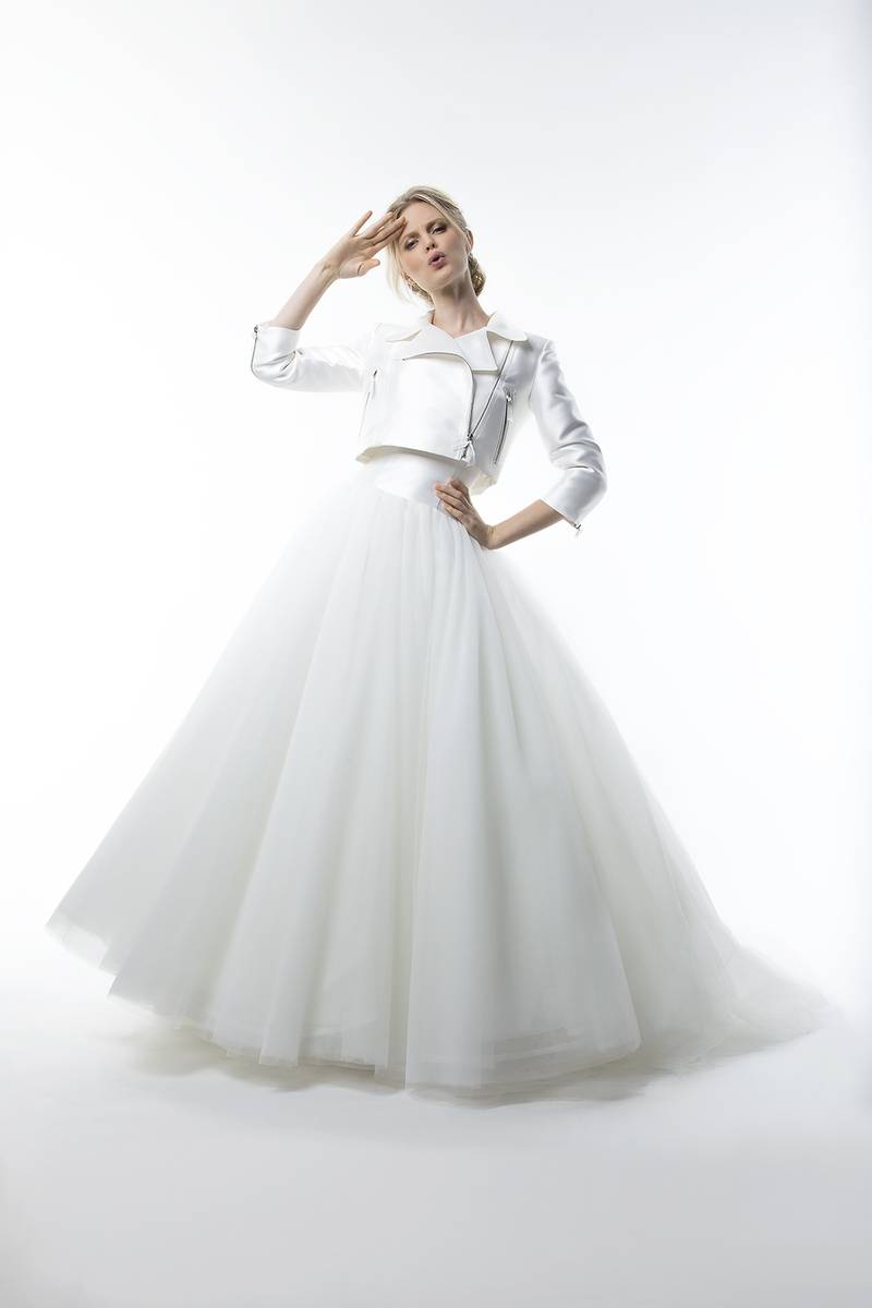 La référence de la robe de mariée Mirella et son perfecto zippé s'inscrit dans la famille de robes modernes qui cassent les codes. La robe de mariée Cymbeline Mirella fait partie de la nouvelle collection 2021. Cette robe de créateur se distingue par sa coupe princesse sur le corsage en mikado uni et sa jupe de mariage en tulle spectaculaire.