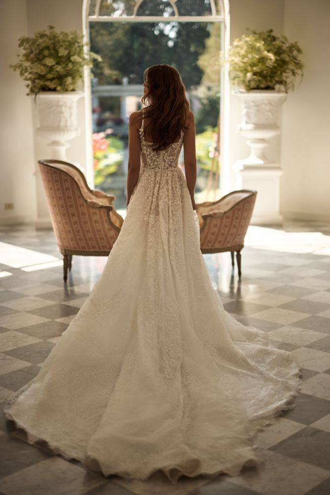 Le corsage semi-transparent, renforcé par des boning et ses bretelles fines, offre un maintien parfait de la poitrine et valorise le port de tête. Les broderies florales, appliquées à la main sur une délicate dentelle chantilly, ajoutent un raffinement unique. La fermeture zippée garantit un ajustement sécurisé, quelle que soit la taille, et la longue traîne confère à l’ensemble une véritable allure de princesse. Cette version de la Noomi grande taille répond à toutes les attentes de confort et de mise en valeur pour une mariée radieuse quel que soit son gabarit.