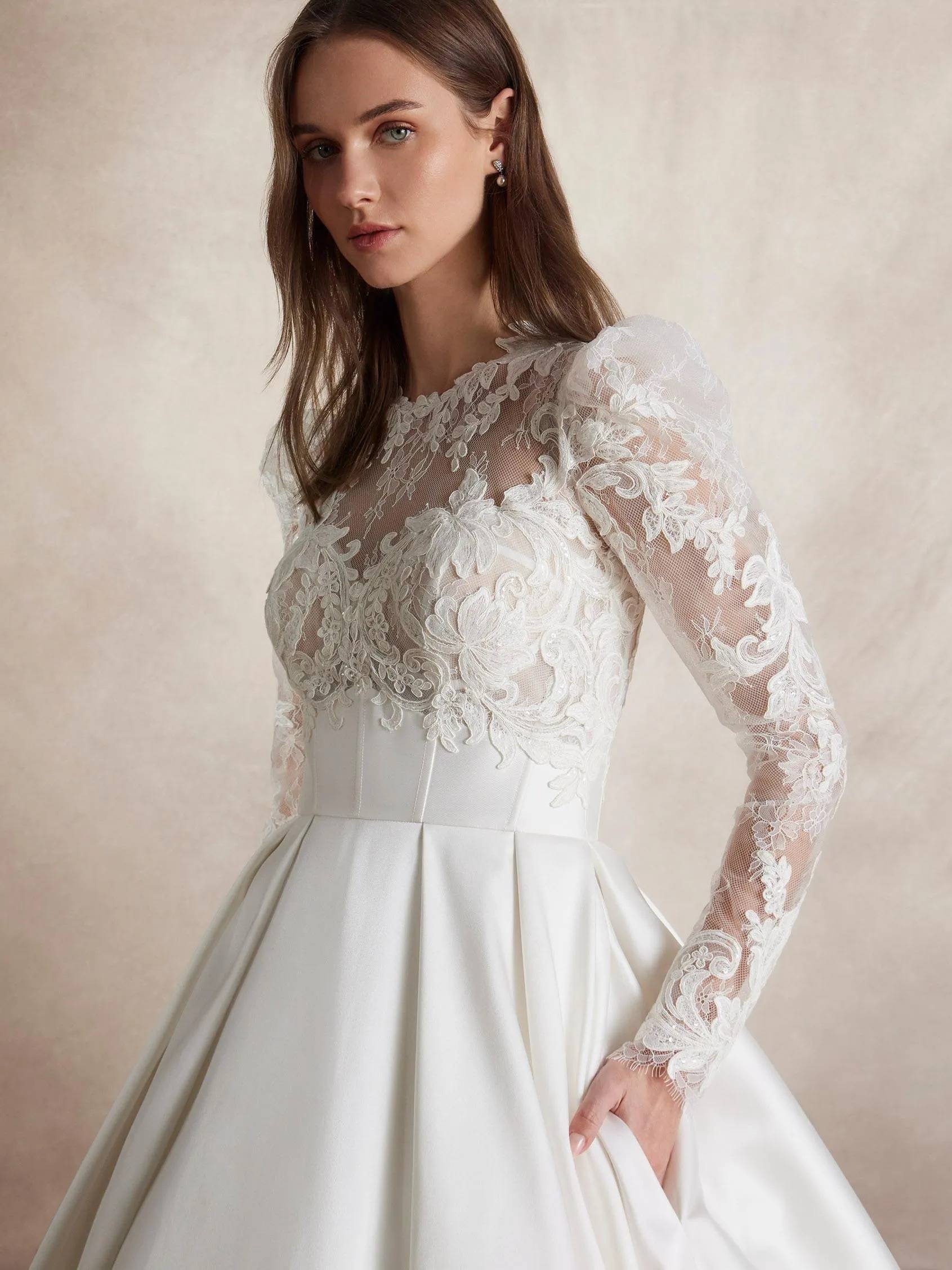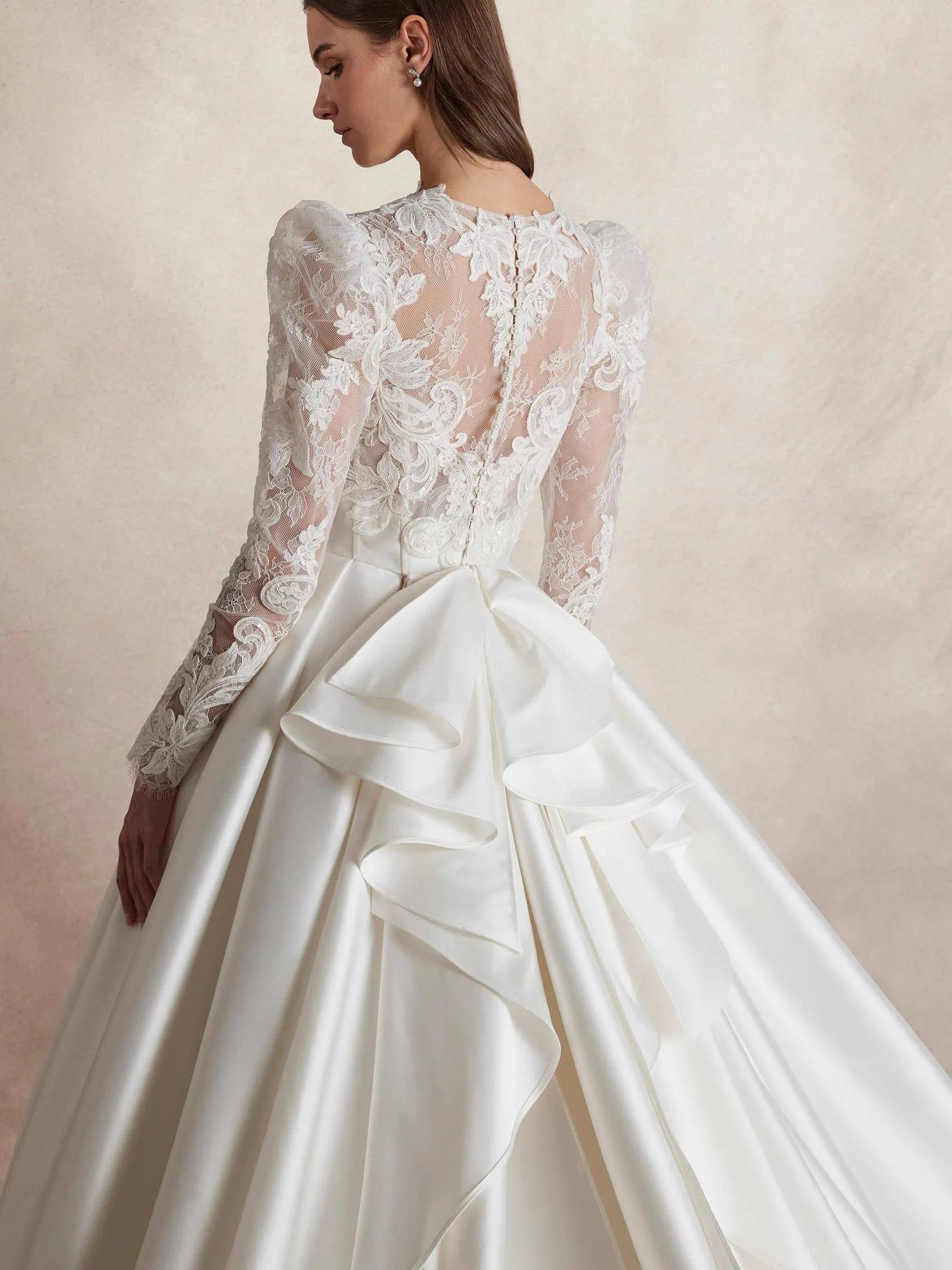 Son somptueux mikado se marie à un corsage en dentelle brodée à manches longues, avec un sublime effet bustier cœur en transparence. Cette robe, pensée pour la mariée romantique et majestueuse, séduit autant par sa traîne cathédrale de 200 cm que par son dos transparent orné de boutons délicats, soulignant une taille haute et un port de tête élégant.