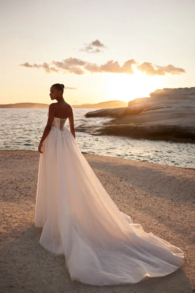 Des coupes sirènes structurées aux robes princesses aériennes, en passant par des modèles courts ultra tendances ou des robes fendue subtilement audacieuses, la maison Eva Lendel réinvente la mariée avec une vision unique : féminine, affirmée et résolument moderne. Dentelles délicates, corsets travaillés, dos nus raffinés, plumes, broderies florales et capes amovibles sont autant de signatures que l’on retrouve dans ses collections.