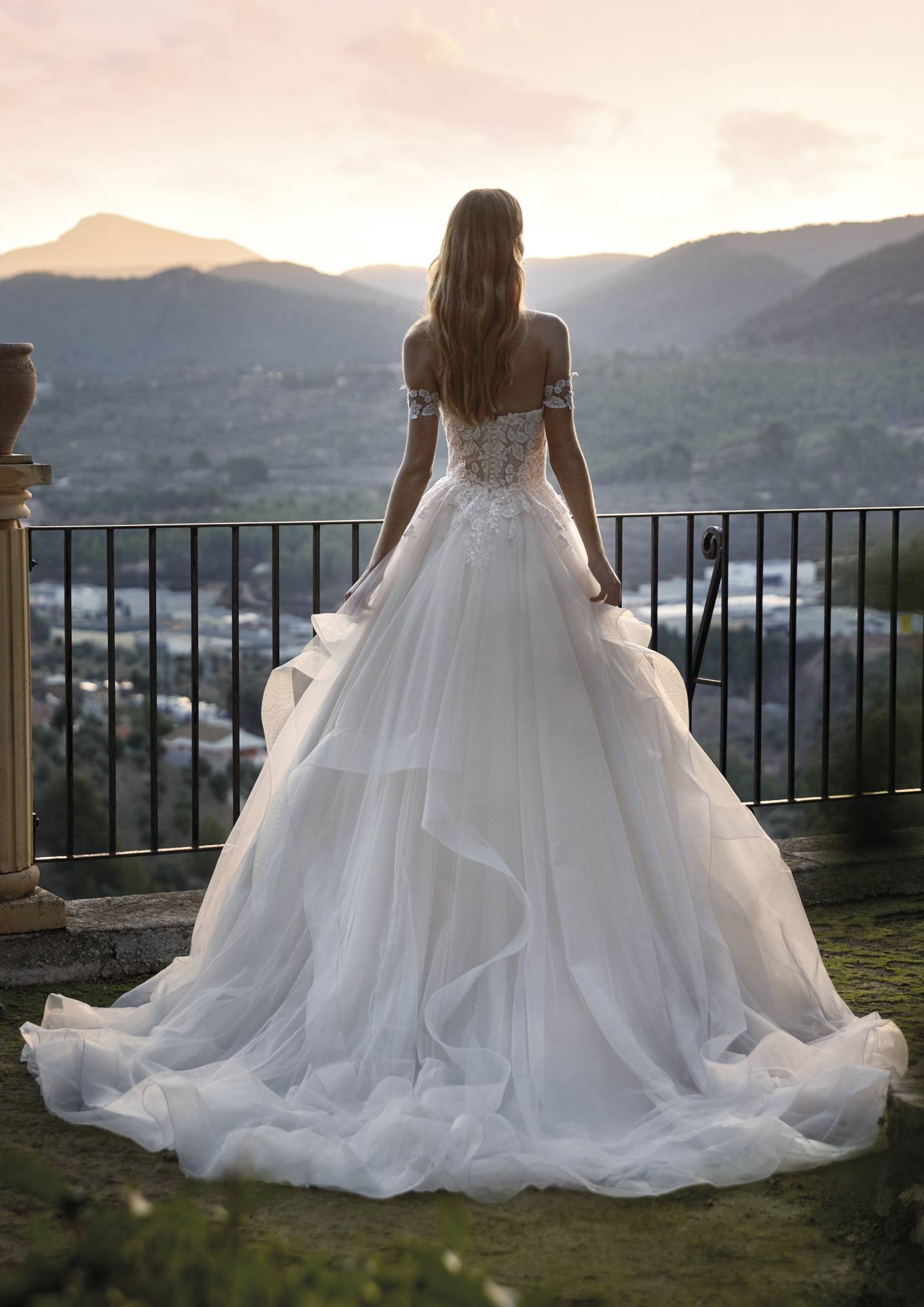La robe de mariée HADAS de Nicole Colet séduit par sa coupe princesse en tulle et sa ligne féminine. Son décolleté en V allonge la silhouette et met en valeur le buste avec finesse. Le dos arrondi se ferme élégamment et offre un joli contraste avec les mancherons courts en tulle, parfaits pour ajouter du romantisme et du confort.