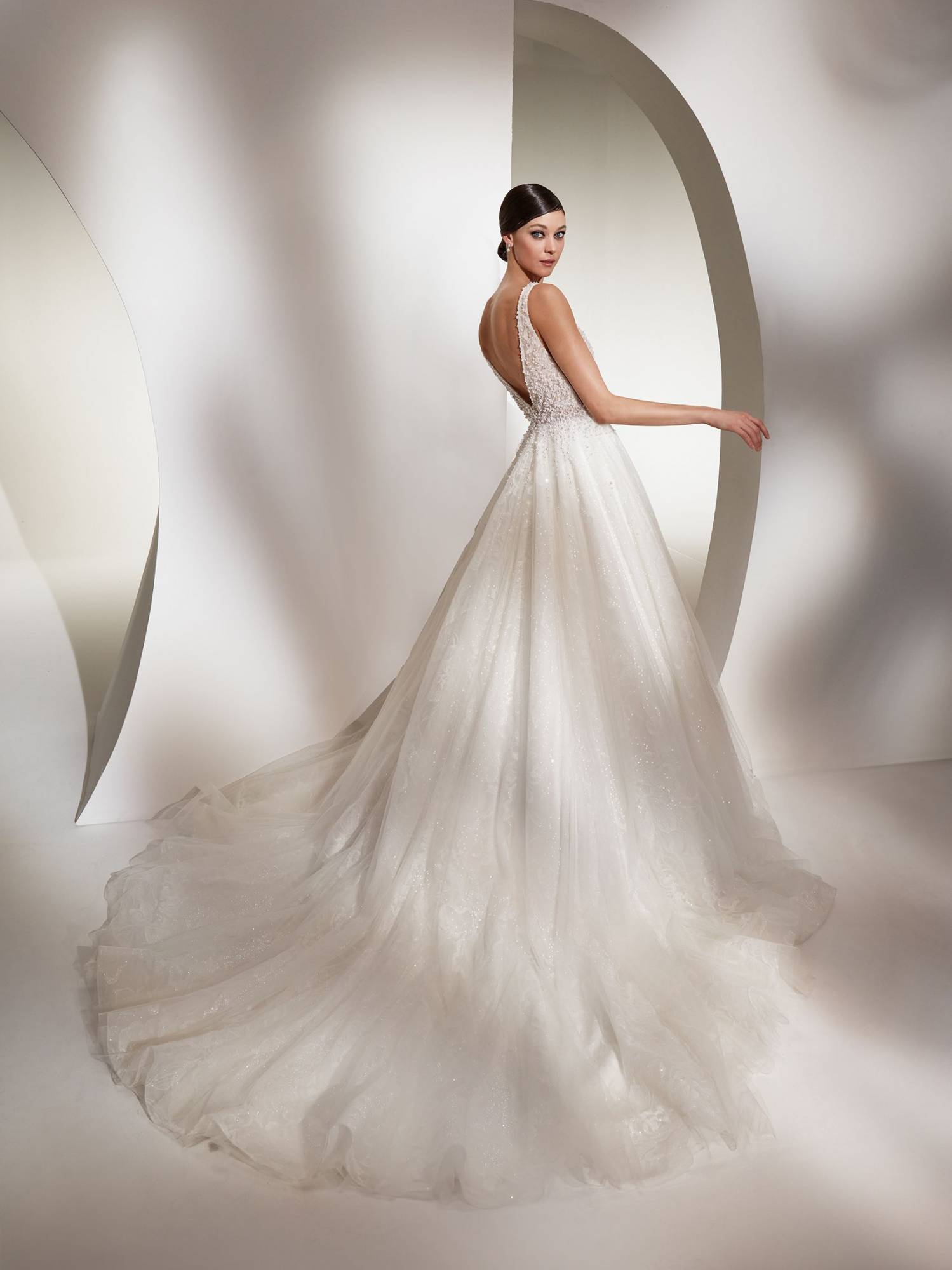 La jupe évasée en tulle de soie fluide complète cette silhouette avec élégance, offrant un mouvement gracieux et une silhouette flatteuse. La traine spectaculaire ajoute une dose de grandeur et de majesté à l'ensemble, faisant de vous la mariée resplendissante de ce jour tant attendu.
