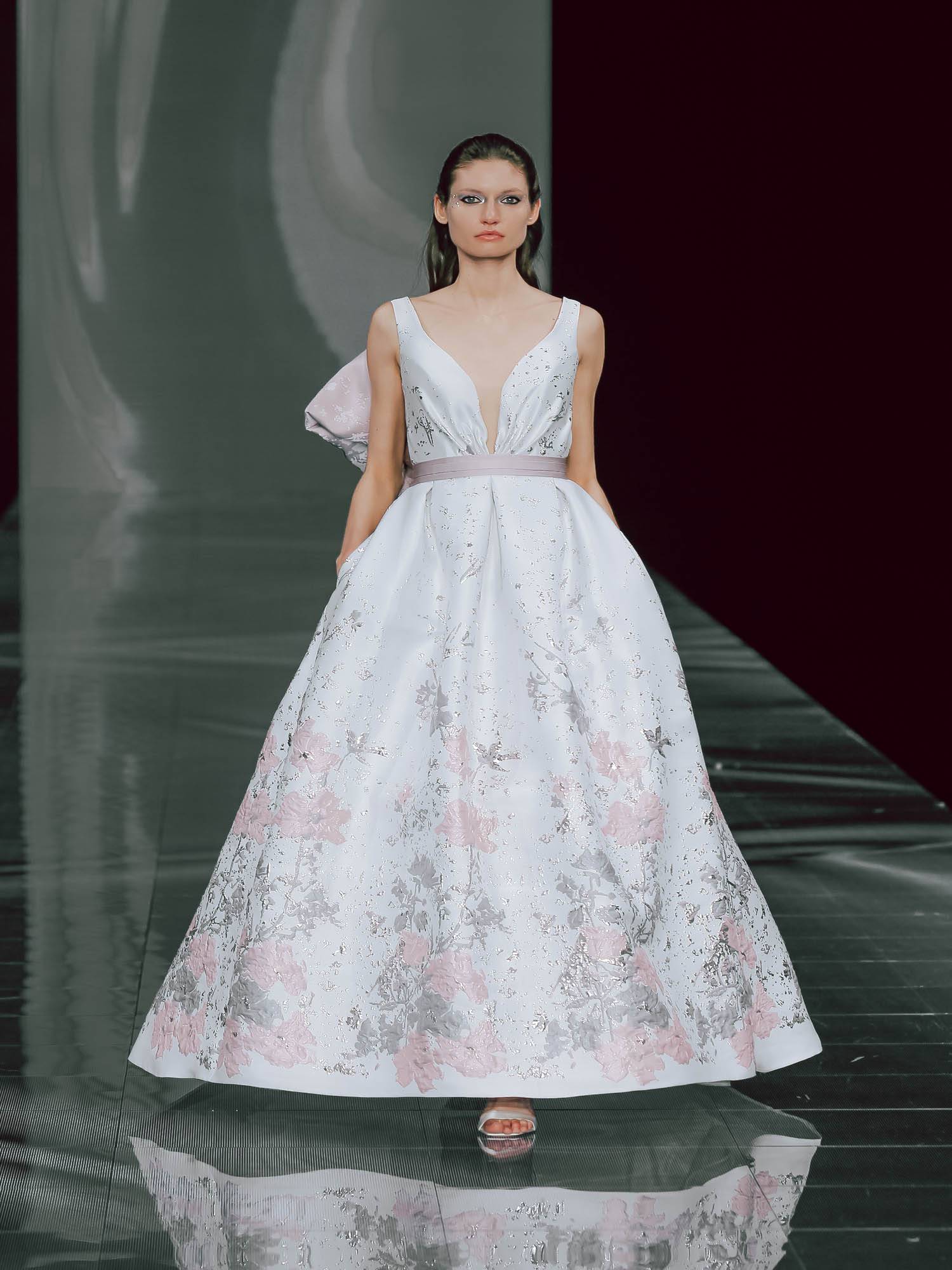 dos ouvert en V pour une envie de pureté et d'élégance pour un style glamour chic, ce qui surprend agréablement un choix audacieux c'est les motifs brodés de couleurs sur le bas de la jupe, si vous souhaitez essayer la robe Senteur Cymbeline Paris il suffit de prendre rdv sur notre site soniab.fr