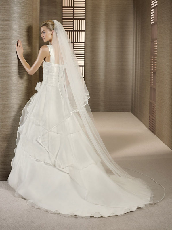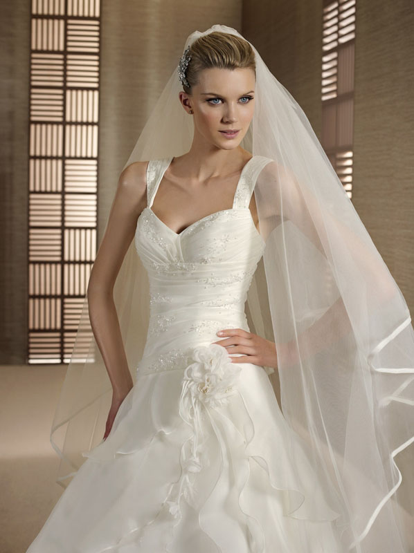 robe de mariée Talmira , de la ligne White One , filiale de la célèbre maison espagnole Pronovias. Robe de mariée de créateur en Organza re-brodé de perles , dans un style classique romantique , et dans un bon rapport qualité prix.