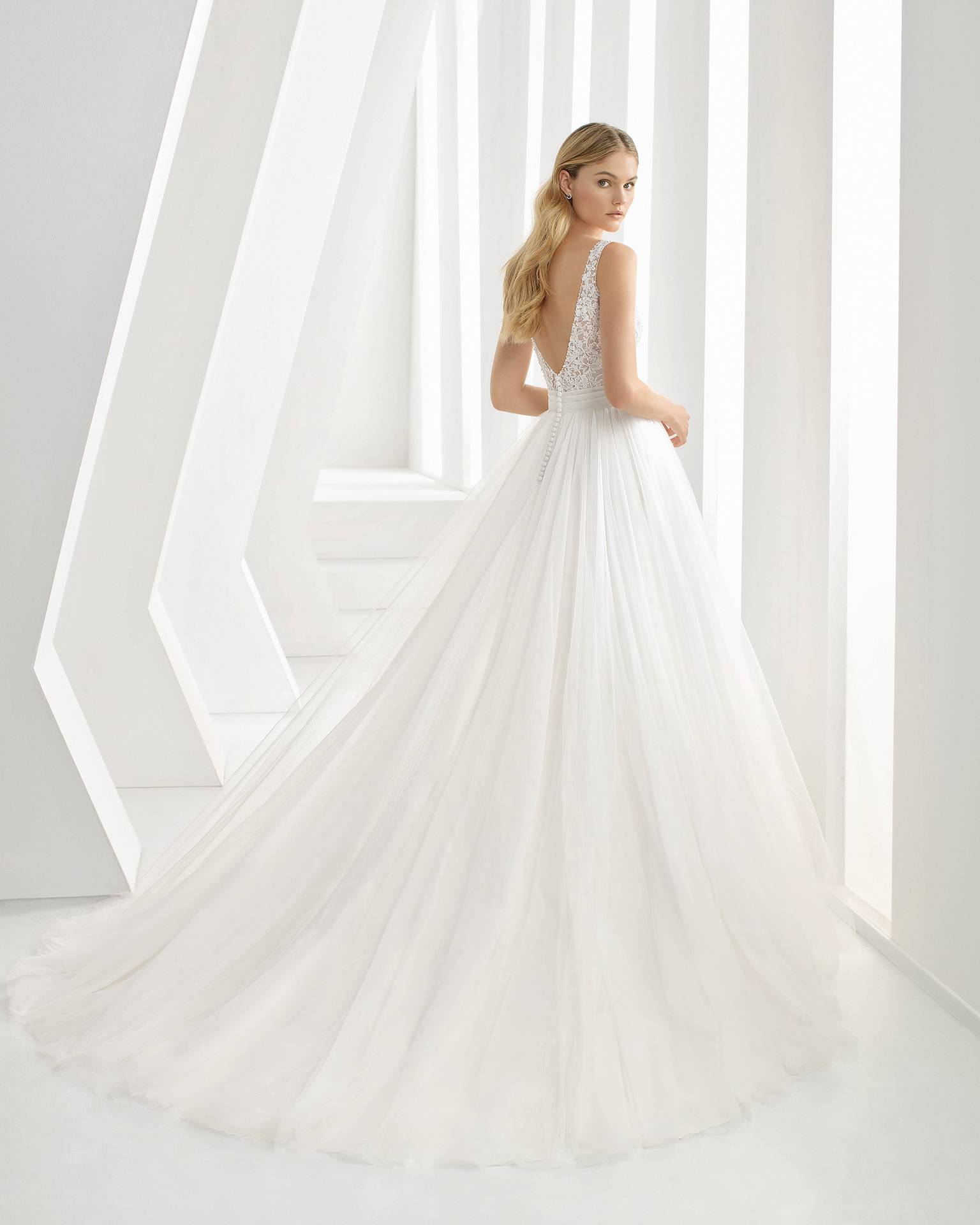 Rosa Clara, à crée Dolley, une robe de mariée raffinée toute en légèreté pour votre plus grand bonheur. Elle est à la fois sobre, chic, épurée et travaillée avec finesse. Cette robecréateur Rosa Clara, style princesse et romantique, est délicatement ajustée avec un corsage. Ce décolleté poitrine, confectionné dans une dentelle de qualité, s’adapte parfaitement à votre silhouette.