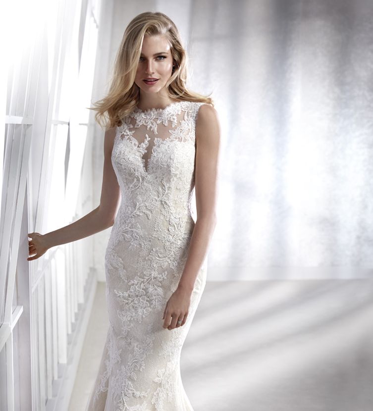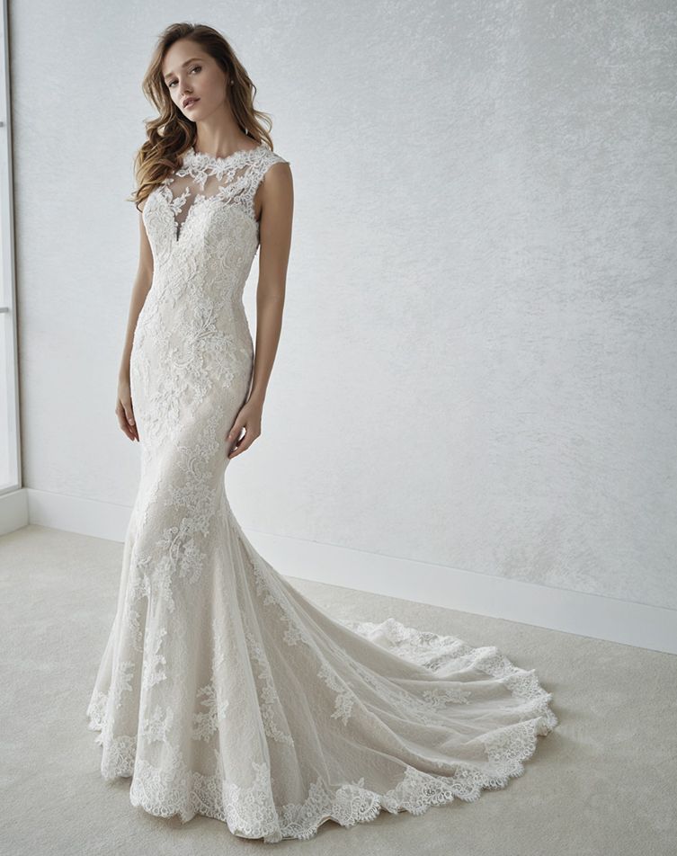 Cette robe de mariée du groupe Pronovias collection White One de San Patrick Farena pour cette saison de mariage 2018 qui se profile fait partie des robes best-seller en sirène dentelle.