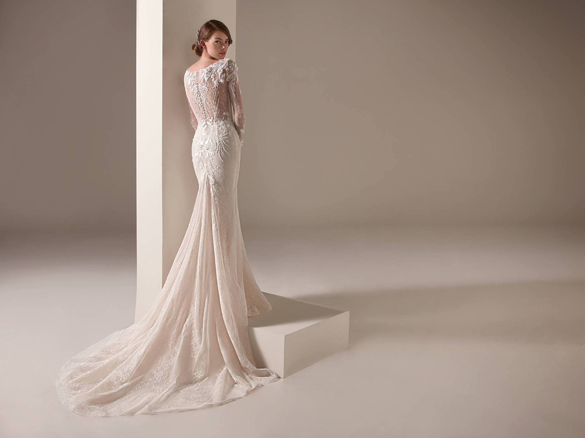 Robe haute couture du groupe Pronovias Privée ligne plus luxueuse et originale de la ligne principale Pronovias Bridal dress, Cette magnifique robe sirène de princesse est à la fois romantique avec une touche de glamour chic de par sa ligne près du corps ajustée.