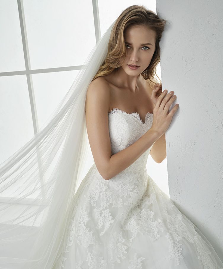 Robe de mariée princesse Fabil White One en dentelle bourdon, forme trapèze, le bustier est décolleté coeur sur le devant et plongeant sur l'arrière.