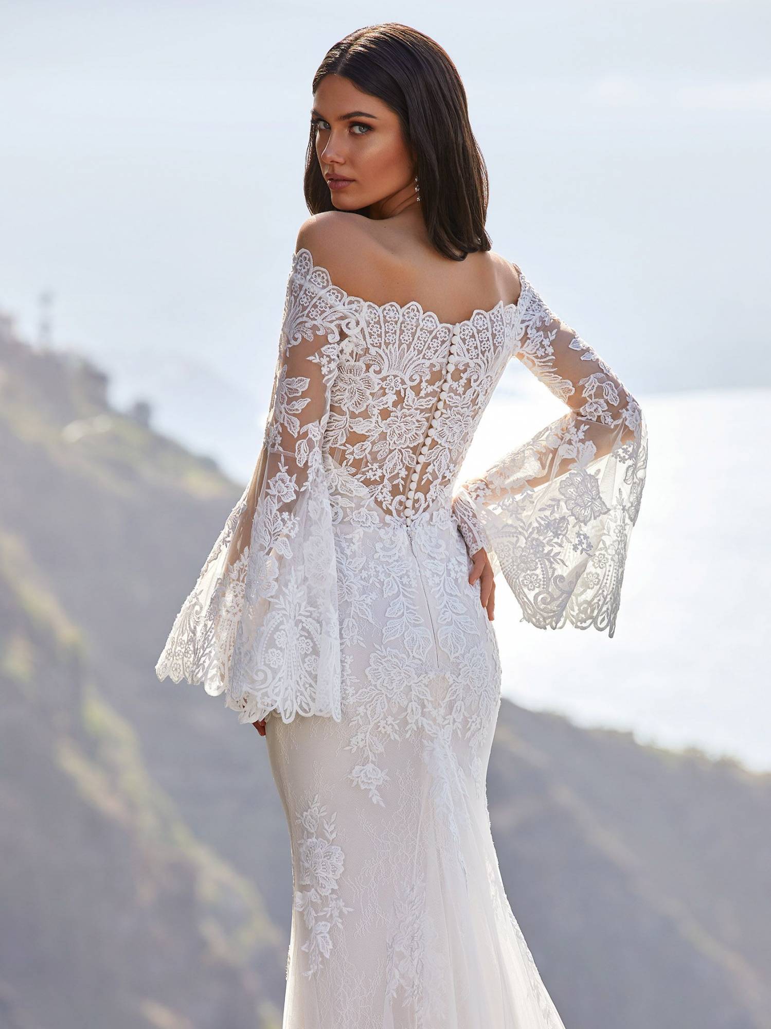 Cette robe Cecil de mariage référence Cecil est une robe sirène bohème recouvert de dentelle florale et guipure vintage. Cette robe de mariée de créateur moderne change et casse les codes avec ses manches en dentelle pagodes sa ligne ajustée affine la taille grâce à sa forme glamour chic.