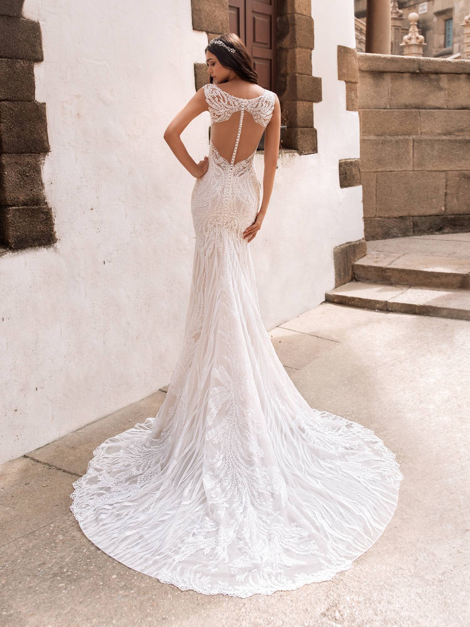 Robe de mariée en dentelle coloris blush ou make up forme près du corps pour un mariage glamour chic cette robe de mariée Pronovias s'inscrit dans un style moderne et actuel . Le groupe Pronovias demeure le spécialiste de la robe de mariée de créateur fourreau ajustée.