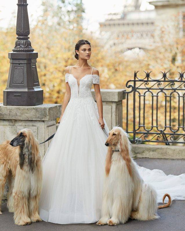 Cette robe de mariage Rosa Clara Teorema est une véritable robe princesse romantique recouverte de dentelle chantilly florale finement perlée. Cette création du groupe Rosa Clara s'inscrit dans la famille des robes de mariée élégantes et raffinées, ce modèle de créateur affine la taille grâce à son bustier ajusté ainsi que ses bretelles retombantes qui laissent entrevoir les épaules et la nuque de la mariée le tout dans un style glamour chic.