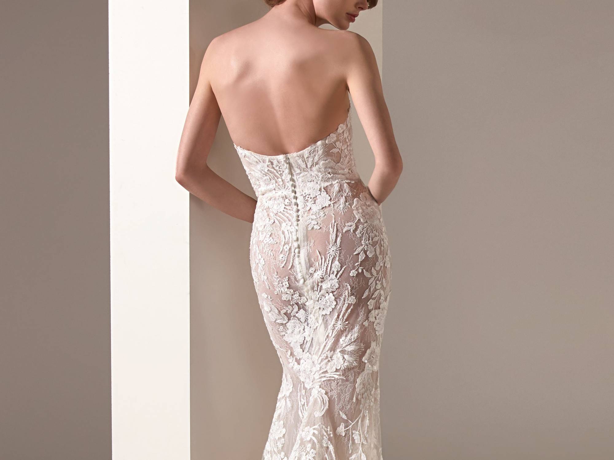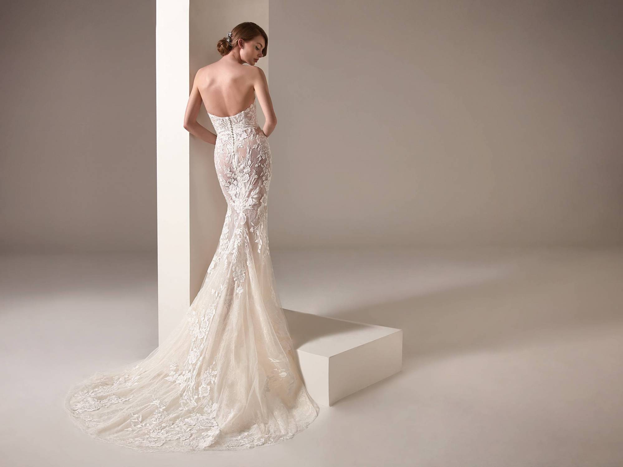 Robe haute couture du groupe Pronovias Privée ligne plus luxueuse et originale de la ligne principale Pronovias Bridal , Cette magnifique robe sirène référence Zaha de princesse est à la fois romantique avec une touche de glamour chic de par sa ligne près du corps ajustée.