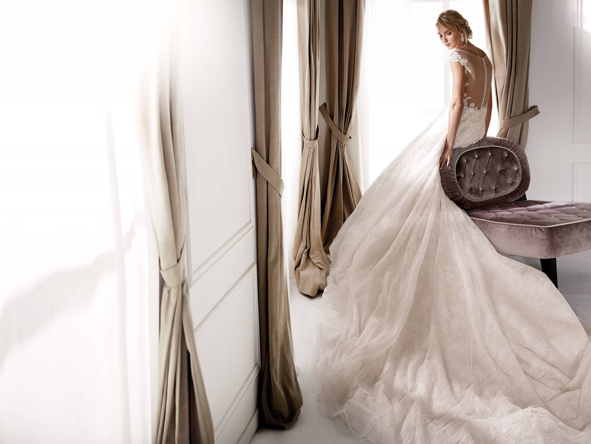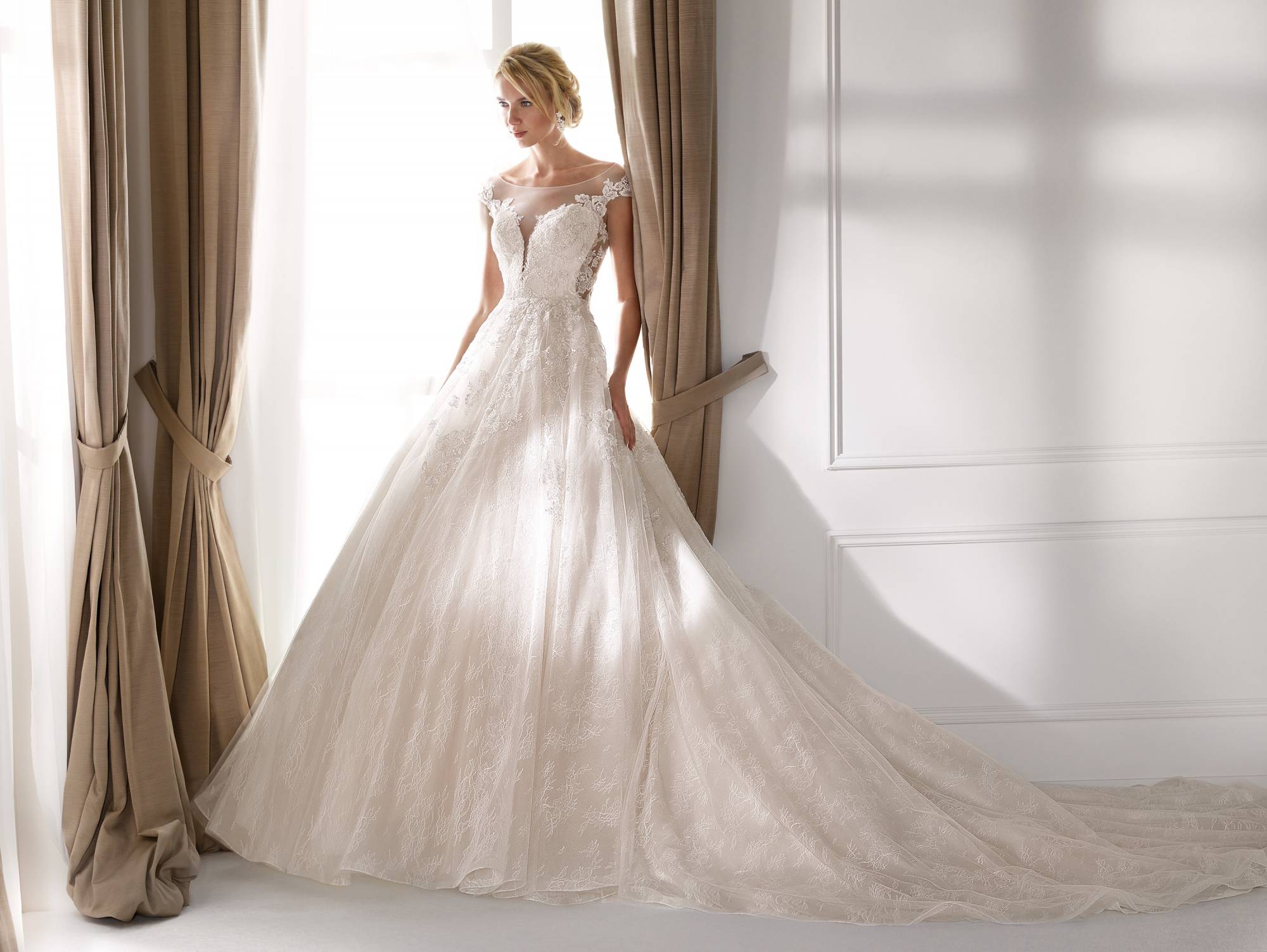 Cette robe de mariée de la styliste Nicole Milano est une robe princesse coloris rose poudré nude , un volume princesse avec une longue traine , la composition de ce modèle est composé de tulle dentelle et applications de broderie dentelle et sequins perlés.