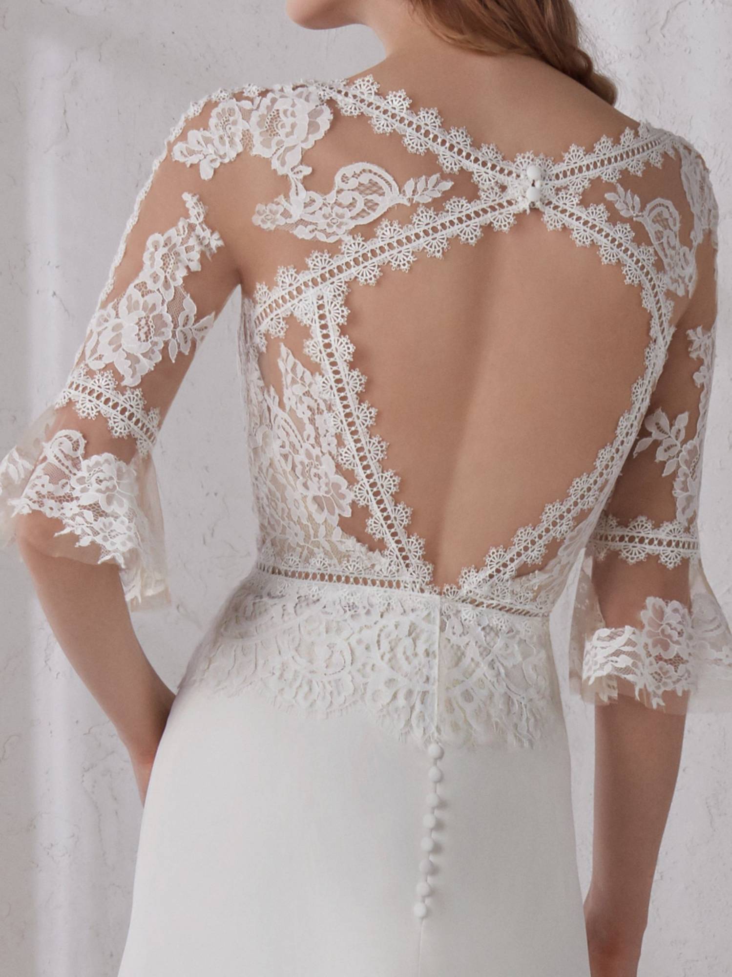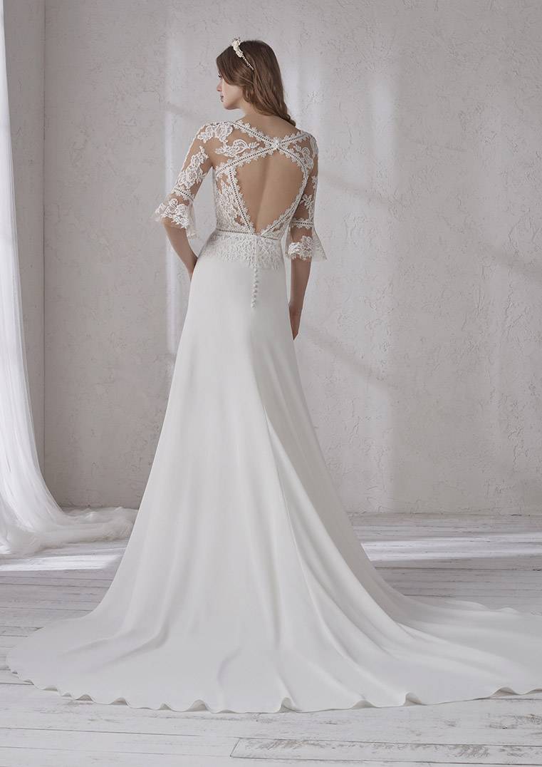 Venez découvrir votre robe de mariée Pronovias référence Marianne , elle est de forme droite évasée fourreau simple. Le haut est composé de dentelle à manches 3/4, avec une basque de dentelle ceinturée taille basse bustier long .Le bas de cette robe de mariée est en crêpe Georgette fluide et léger, cette robe du créateur Pronovias s’inscrit dans une ambiance de style bohème Shabby chic, fluide et simple à la fois, pour une mariée élégante.
